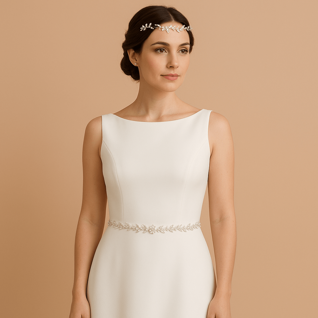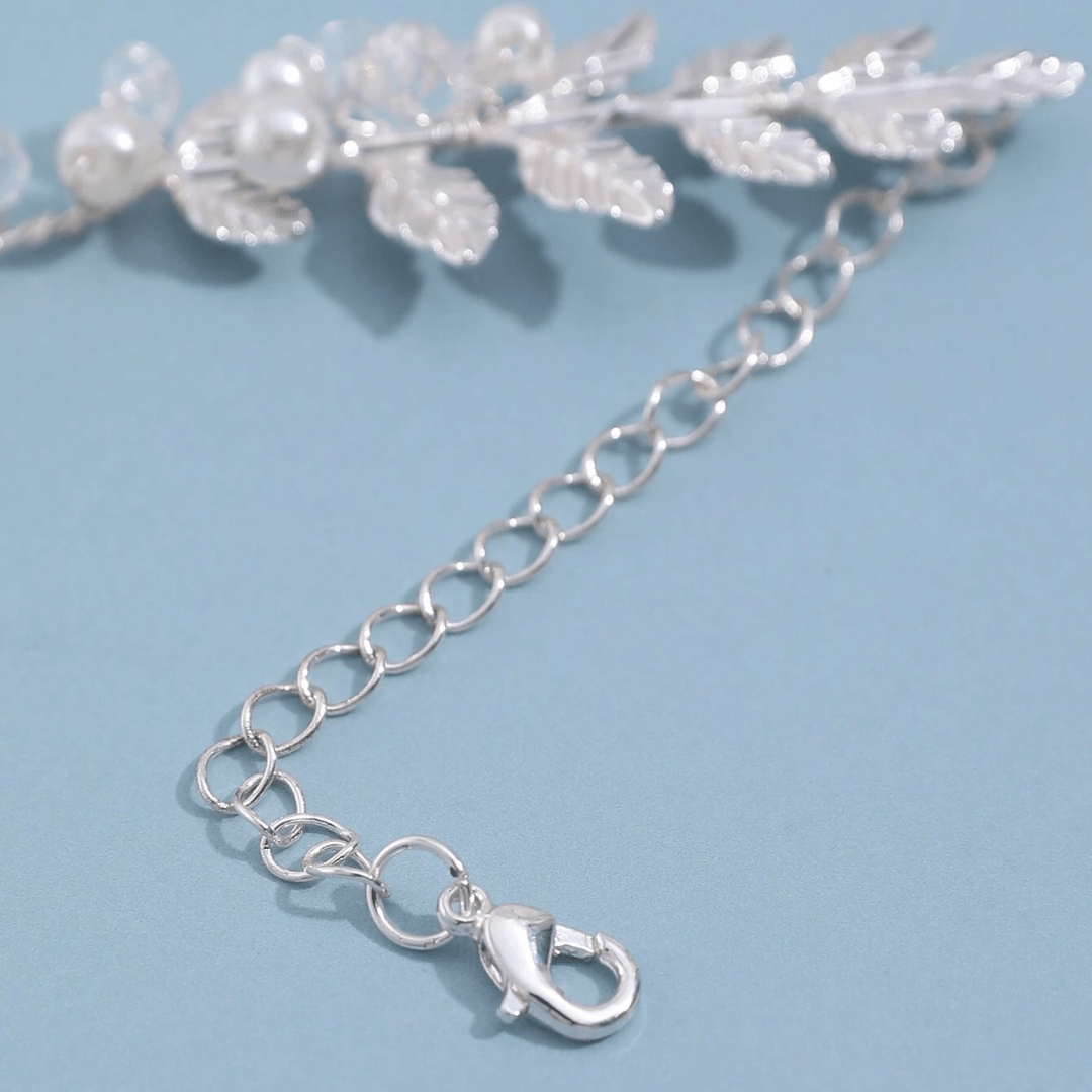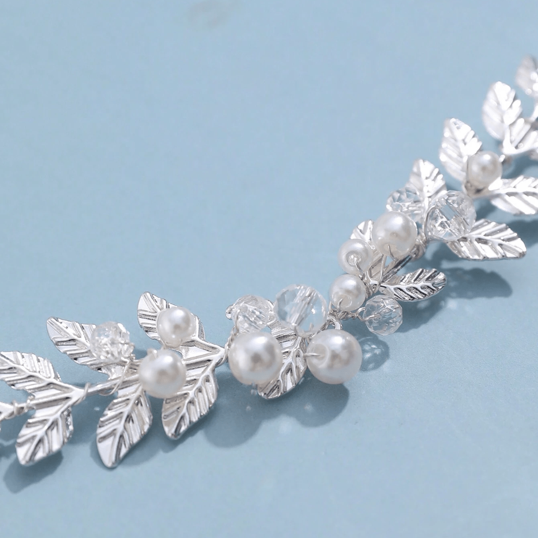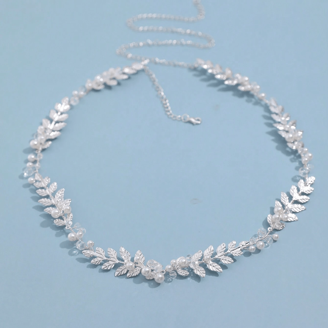 Cinturón muy delicado y brillante, plateado, en forma de hoja con perlas y cristales.
