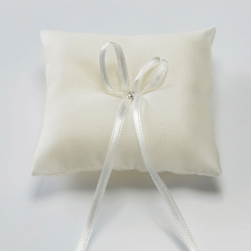 Cojín porta Alianzas. Un diseño romantico y minimalista. Confeccionado en satén, con un lazo de satén que cuelgan del centro para sujetar los anillos.