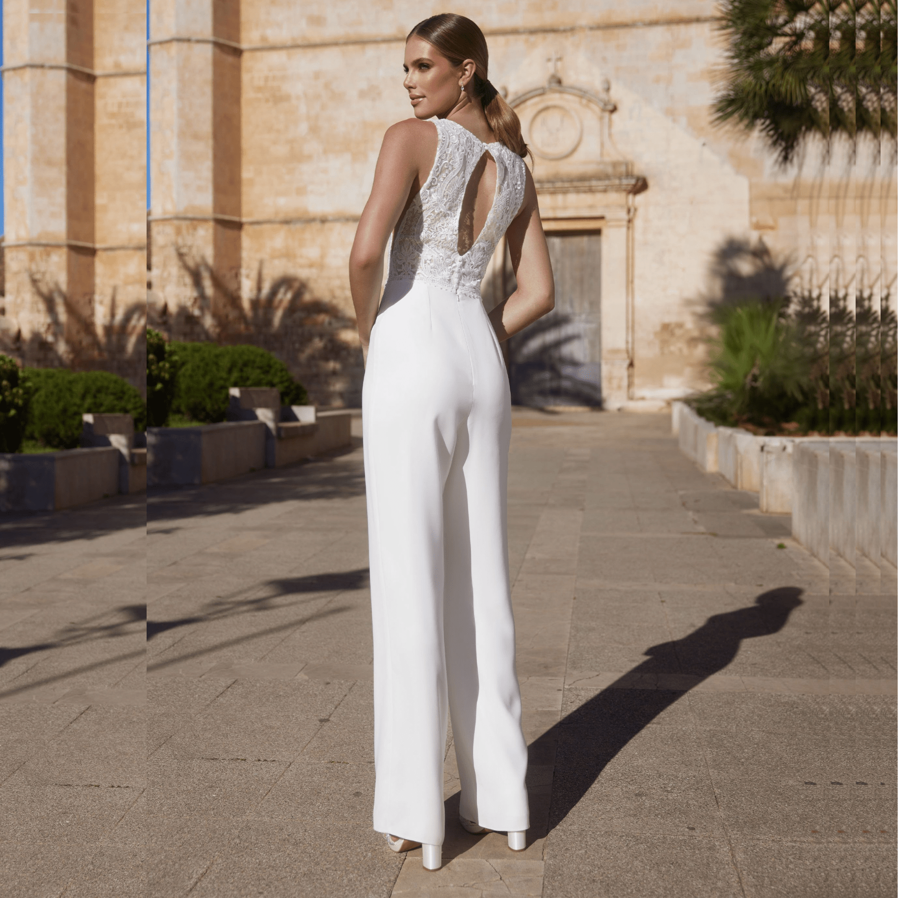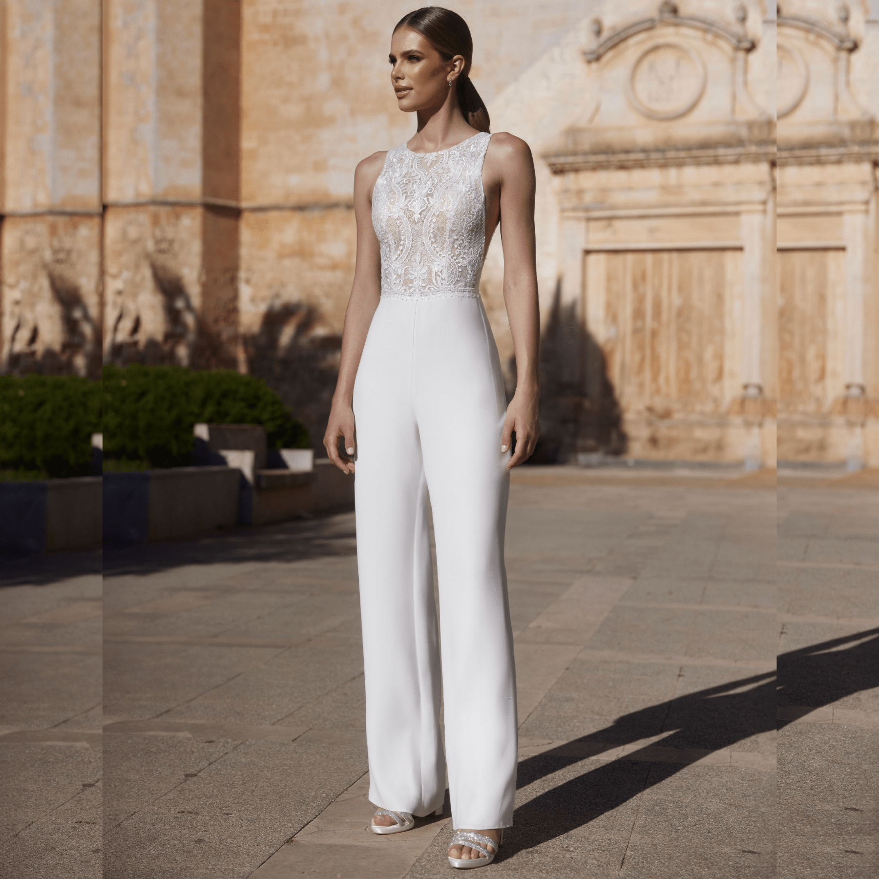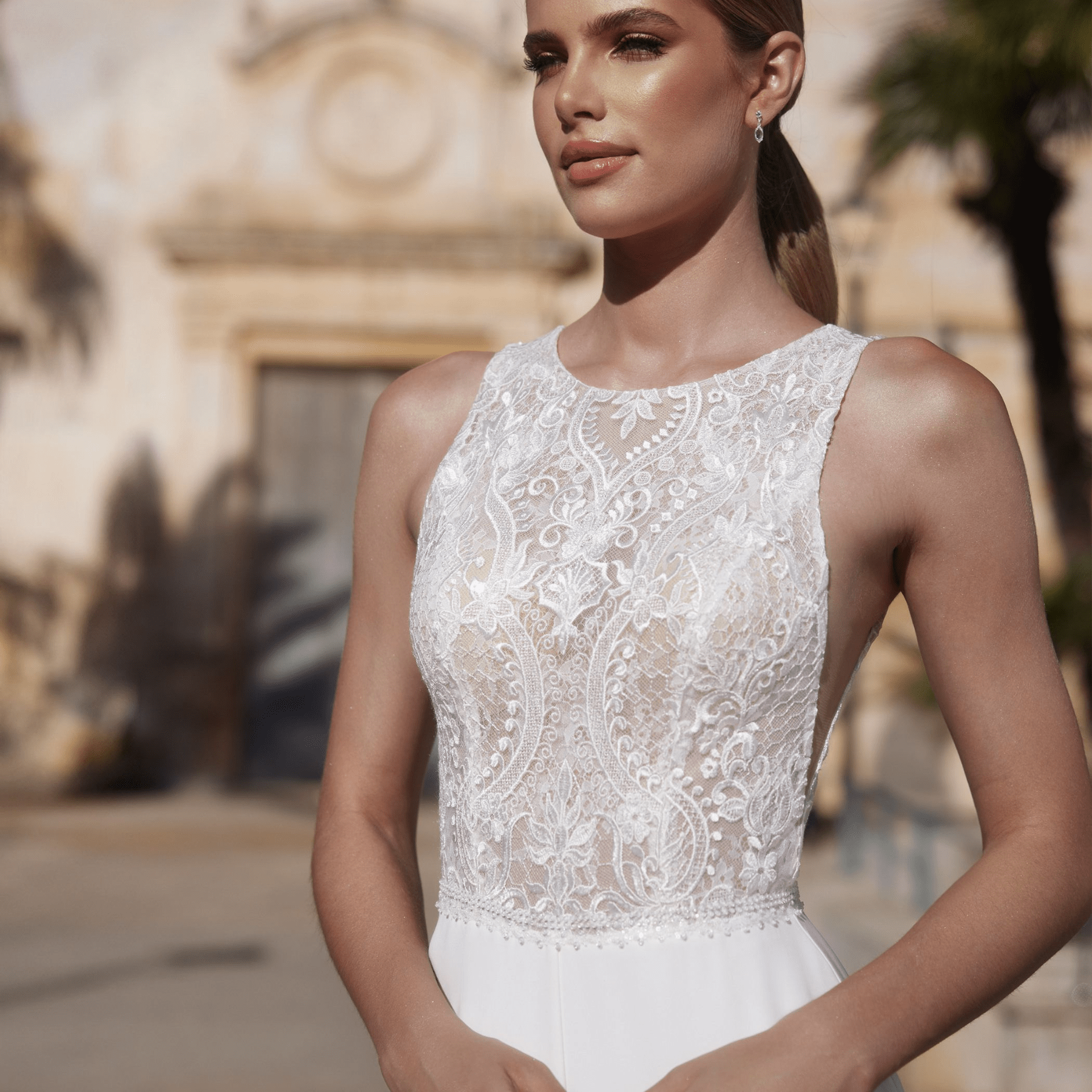 Mono de novia, escote redondo, confeccionado en sablé.