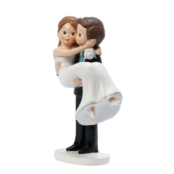 Nuestro tope agrega un estilo romántico y peculiar a tu pastel. Representa a una pareje con traje nupcial, un novio sonriente guiñando un ojo mientras carga a su novia.