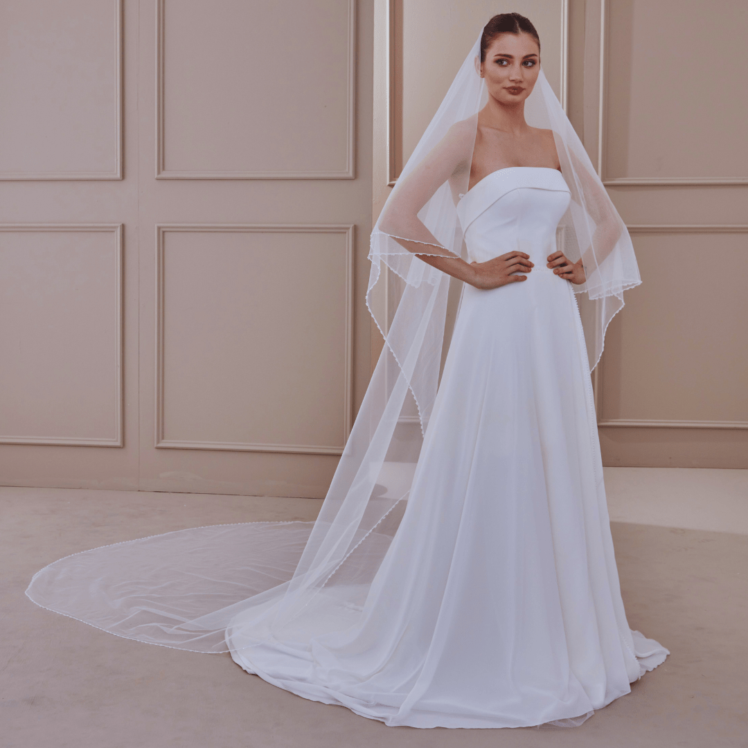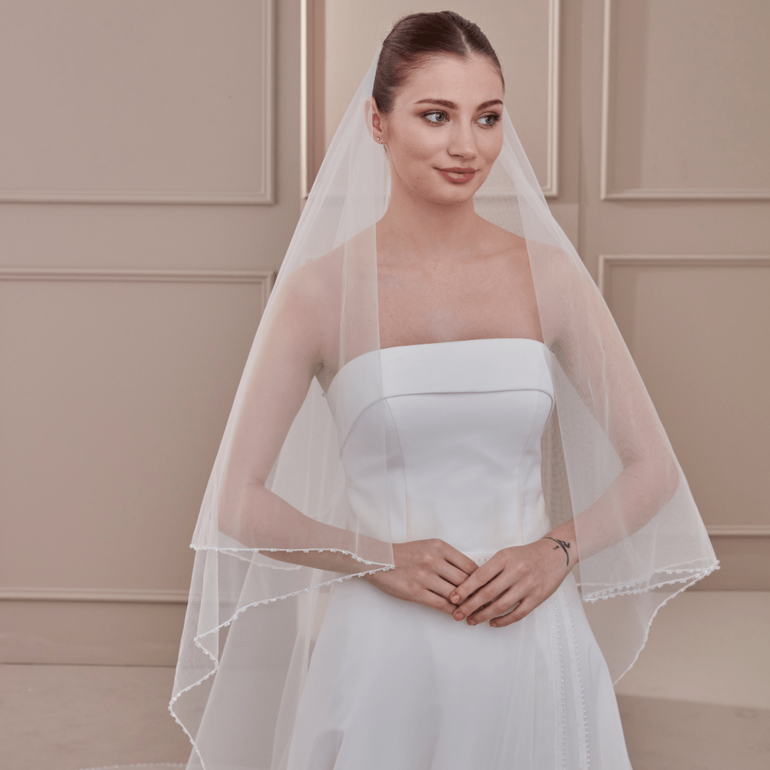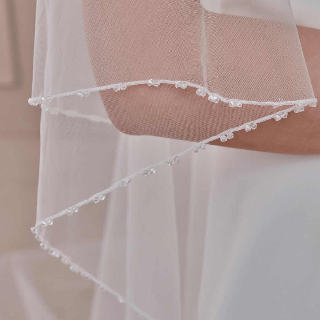 Velo de novia de dos capas con borde festoneado, bordado con cristales alrededor.