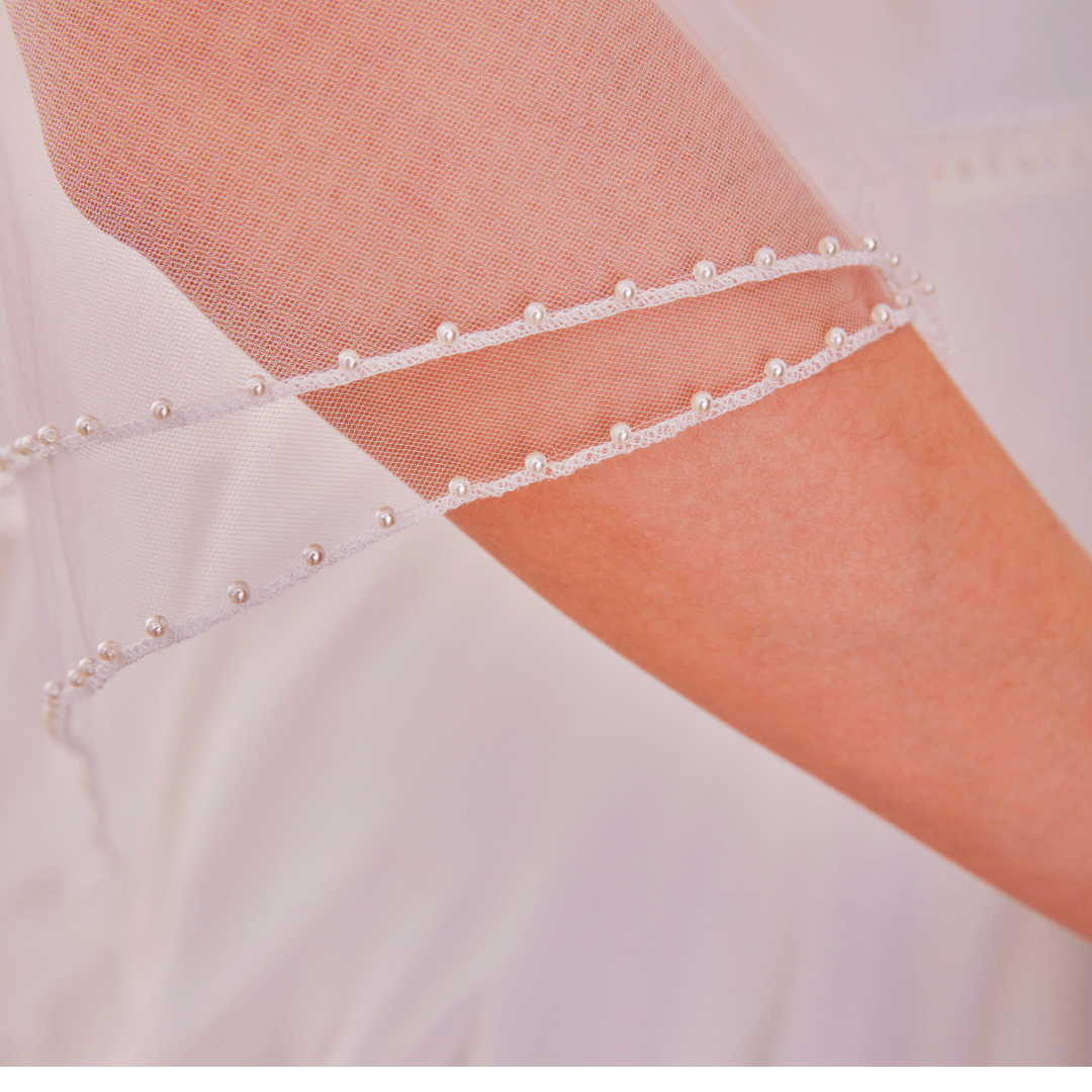 Velo de novia de una capa, bordado con cristales y perlas alrededor.
