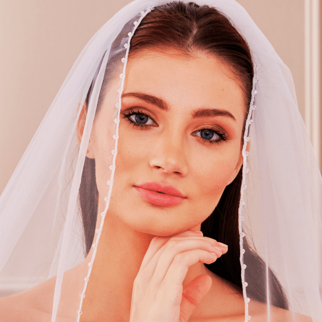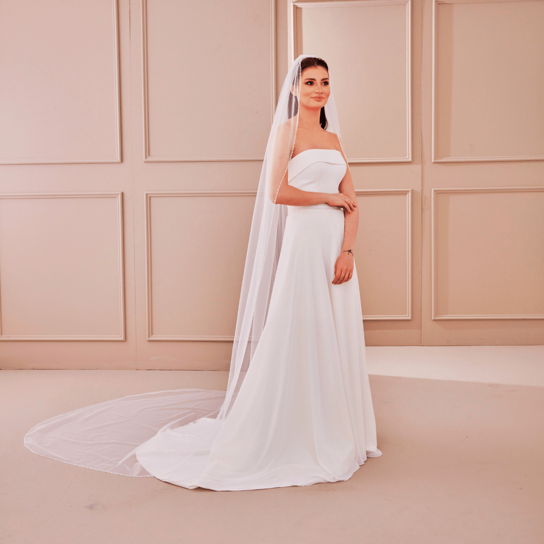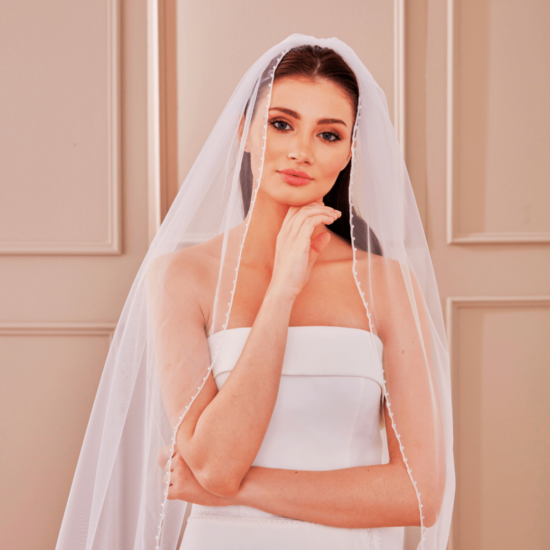 Velo de novia de una capa confeccionado con tul con cristales alrededor.
