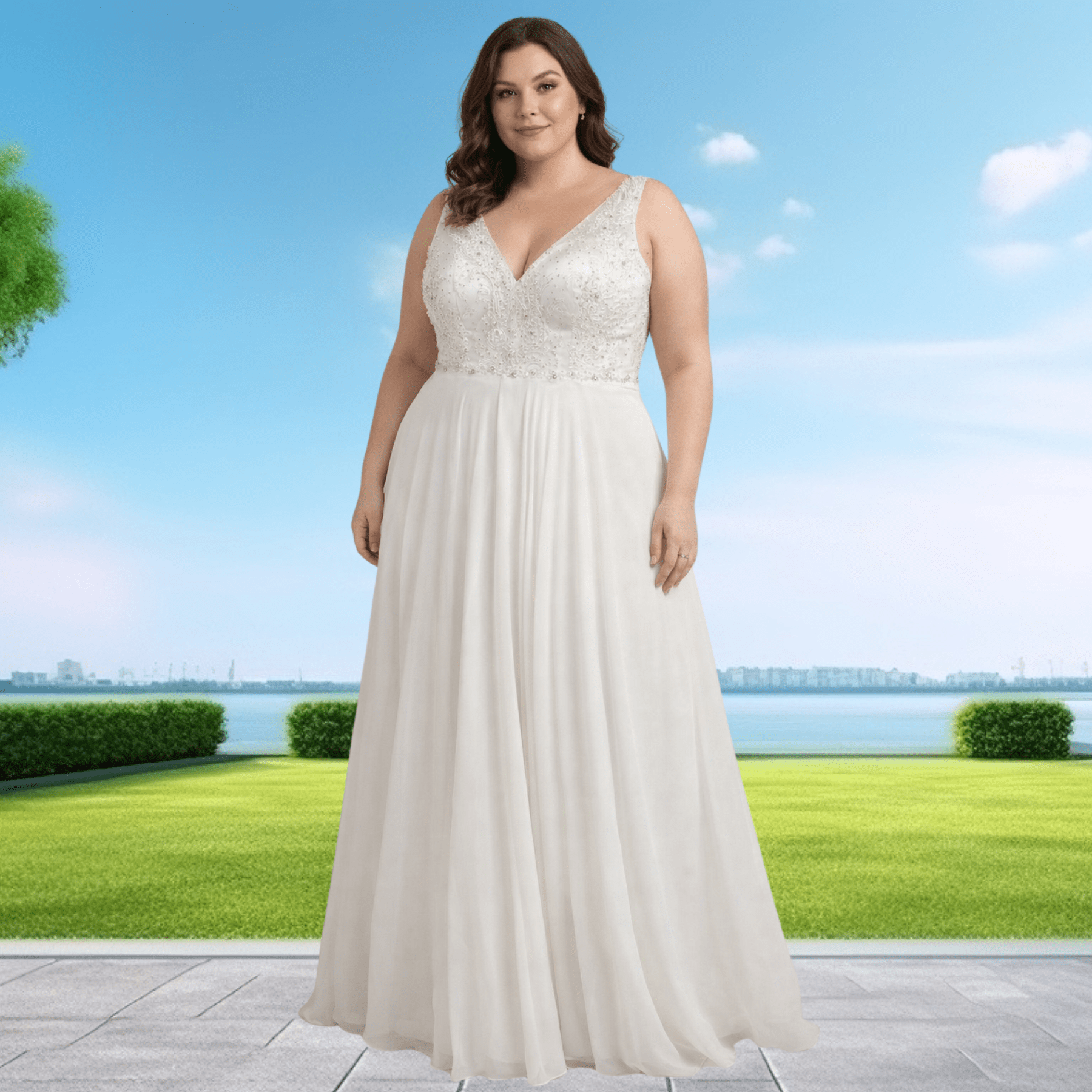 Vestido de Novia corte A, confeccionado en chiffon y encaje.
