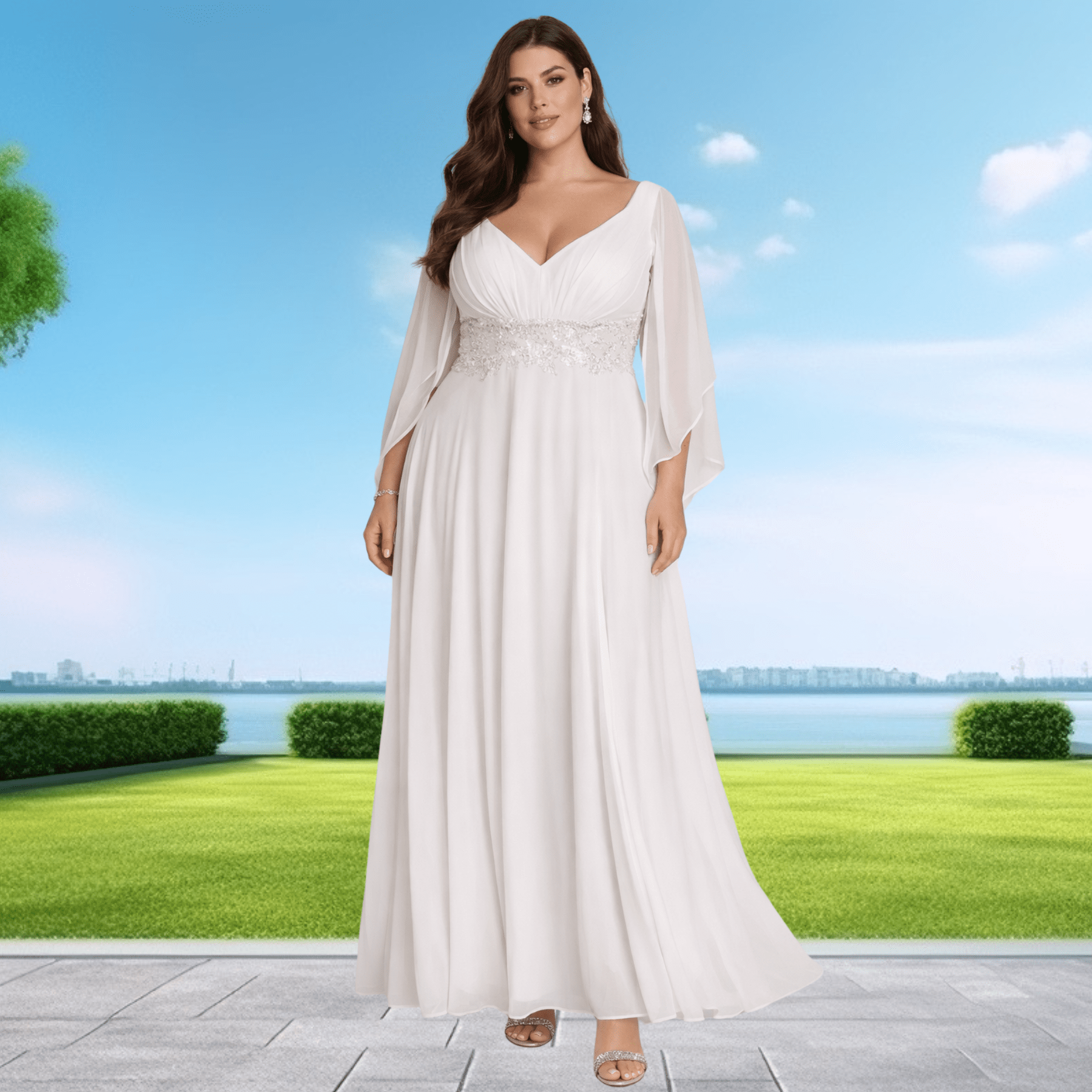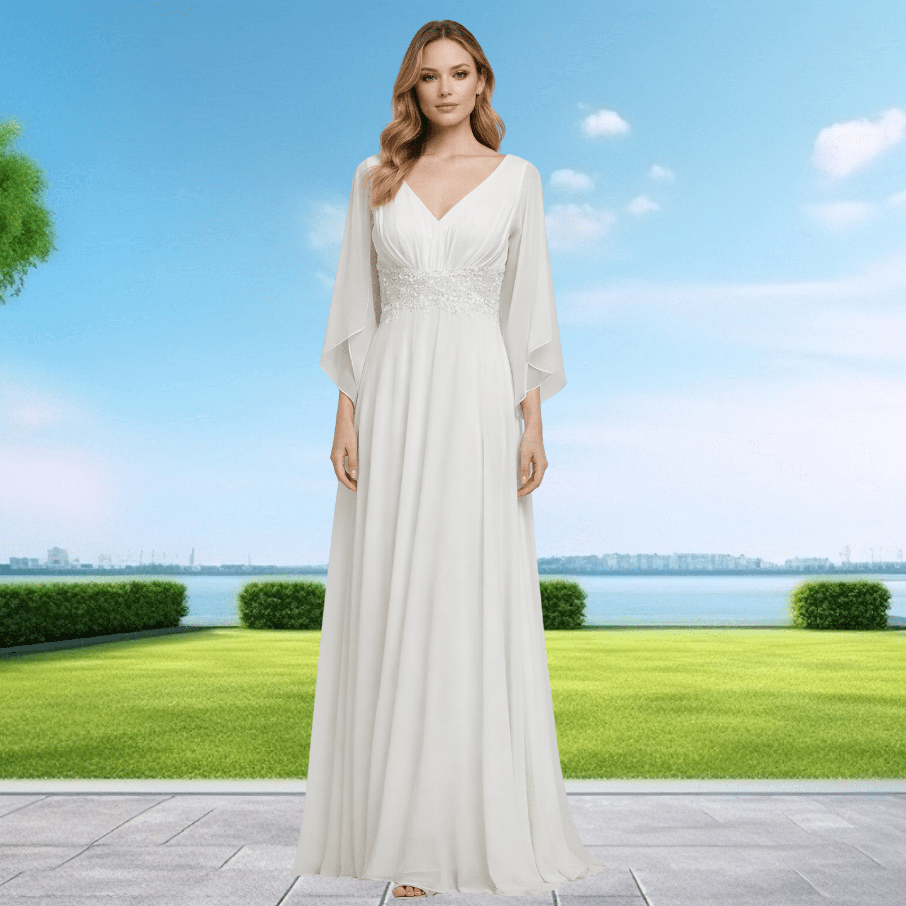 Vestido de Novia corte A, confeccionado en chiffon y encaje.