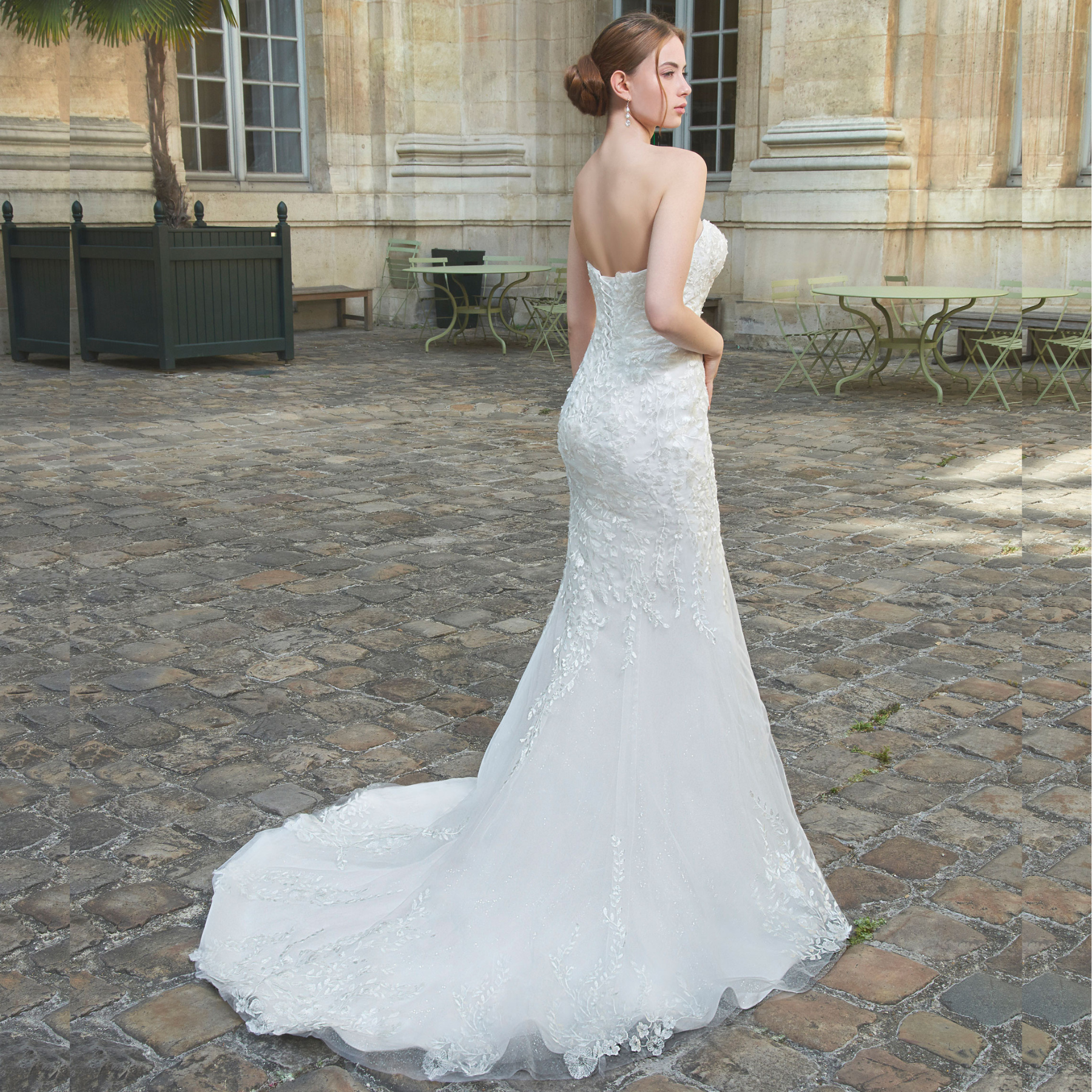 Vestido de novia corte sirena, escote de profundo en corazón, confeccionado en tul, encaje y pedreria.