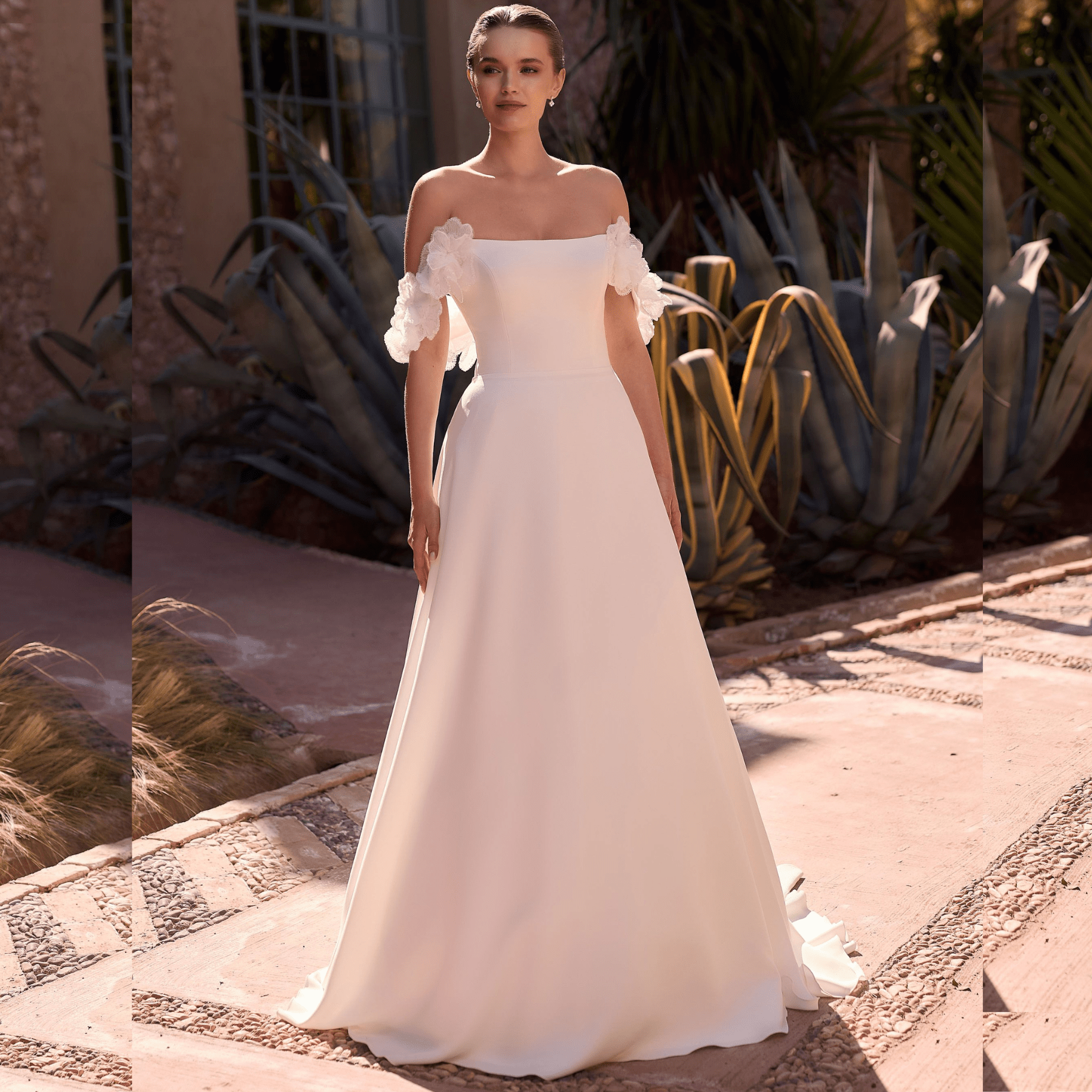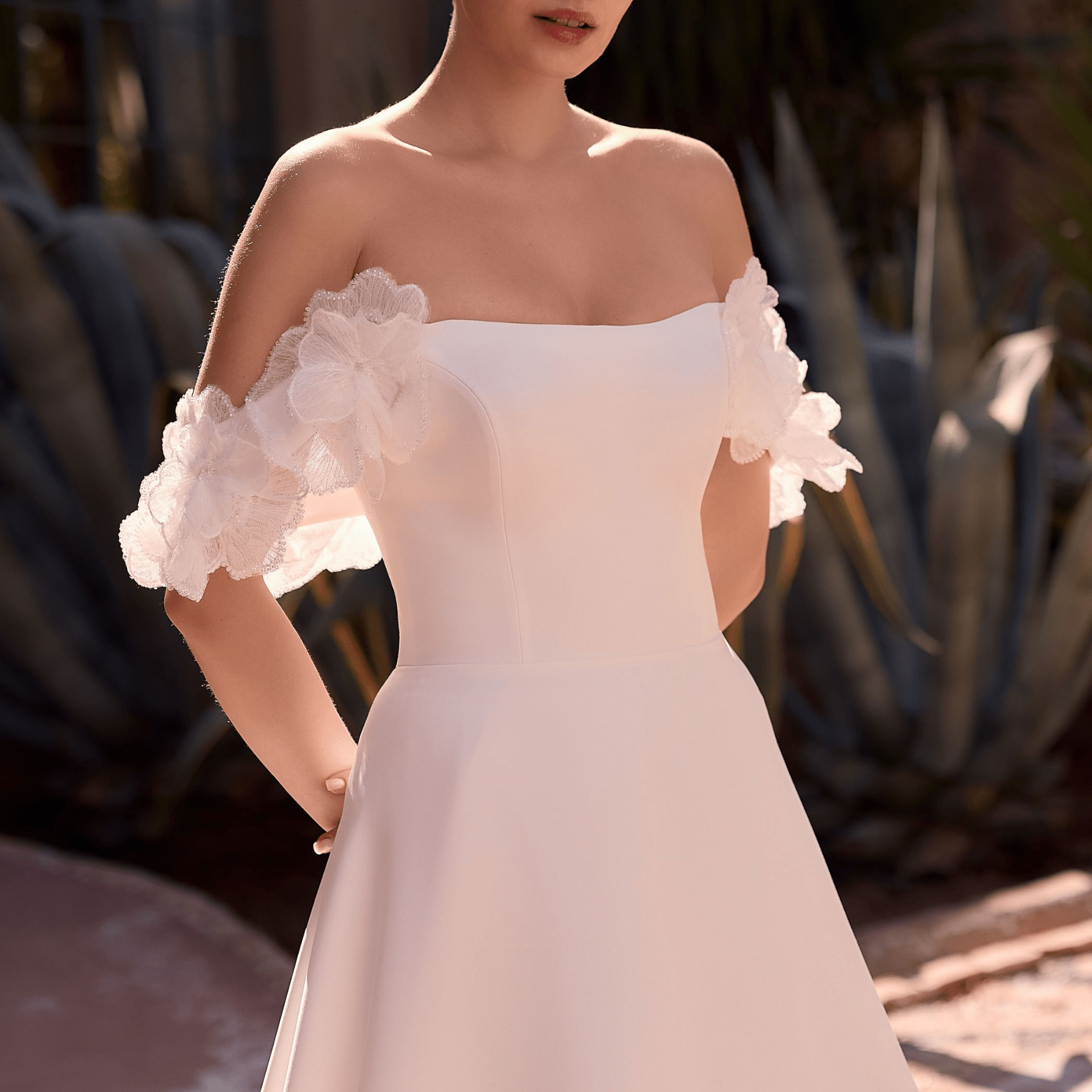 Vestido de Novia corte A, escote strapless , con mangas caidas, confeccionado en crepé.