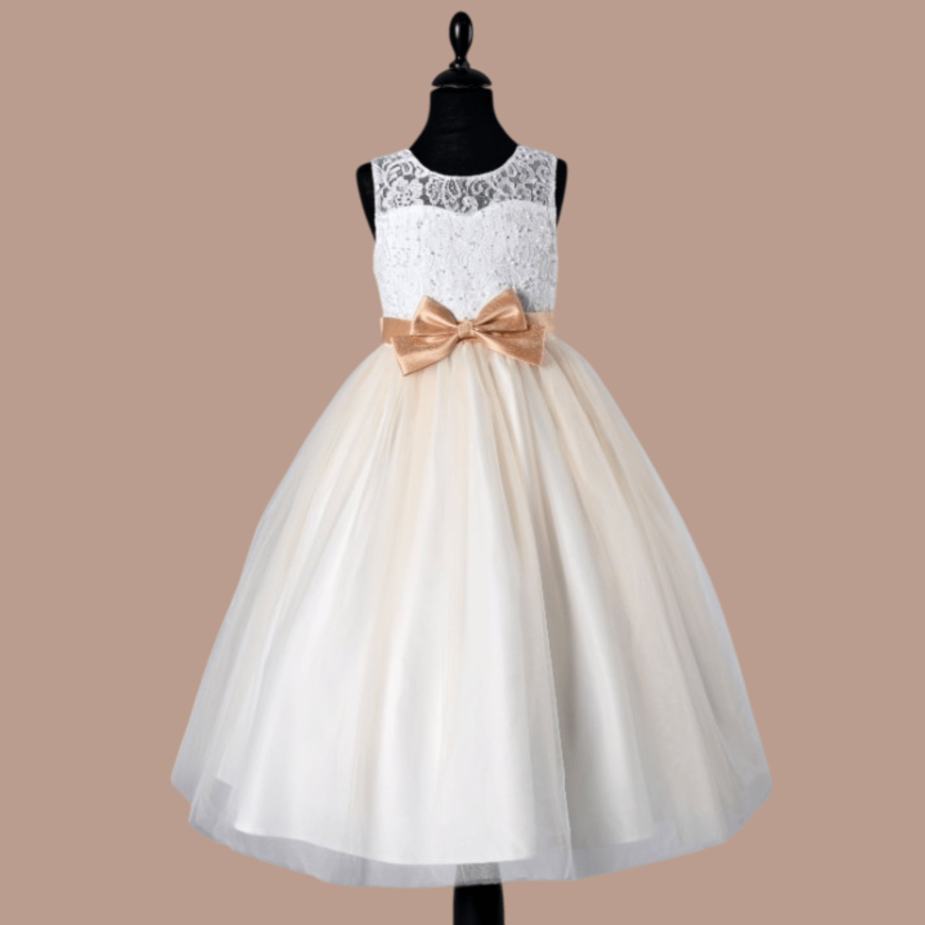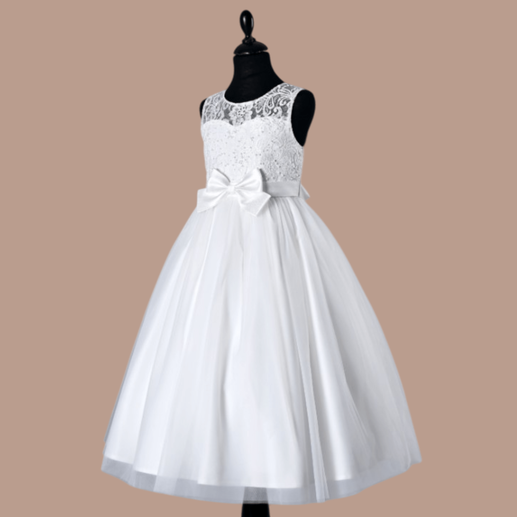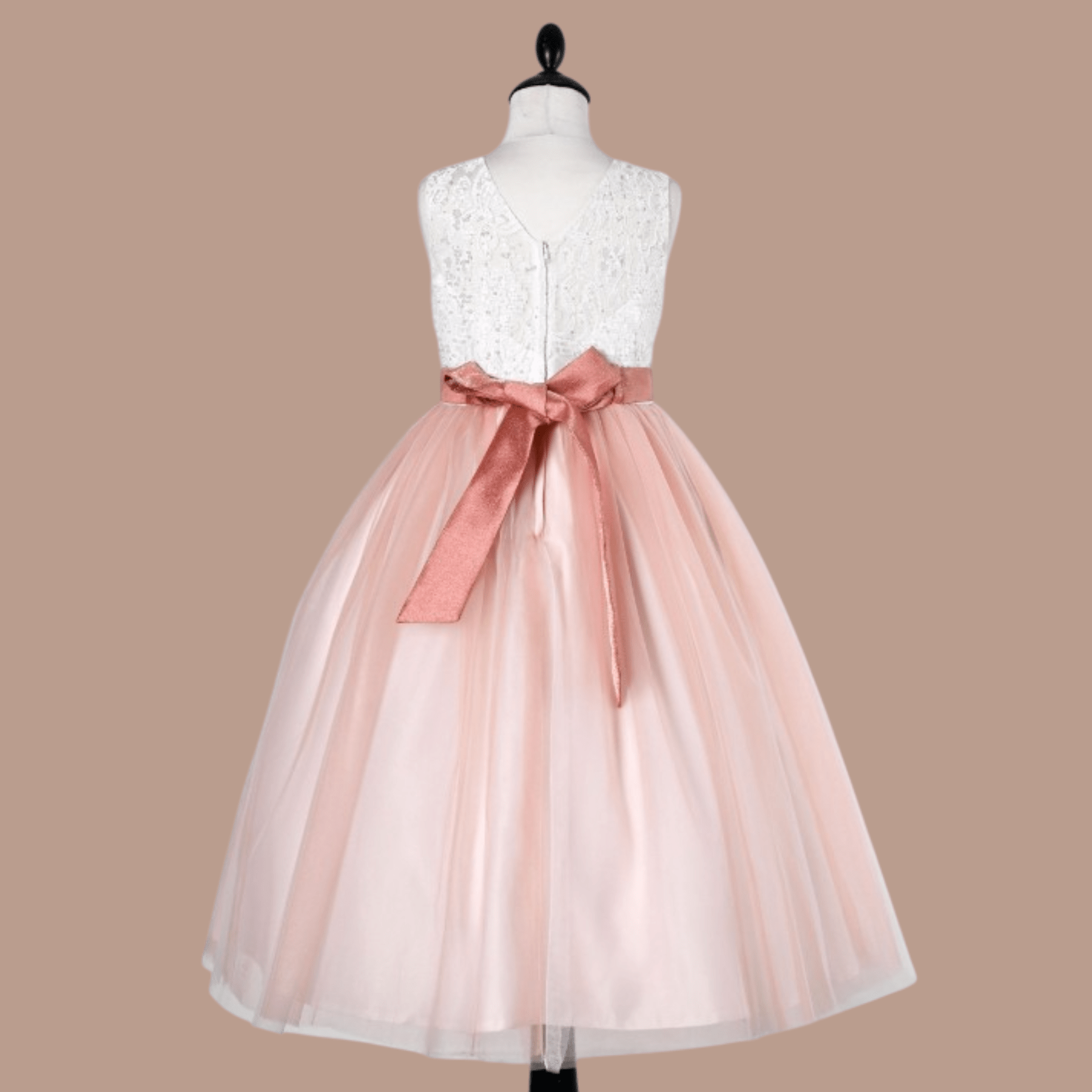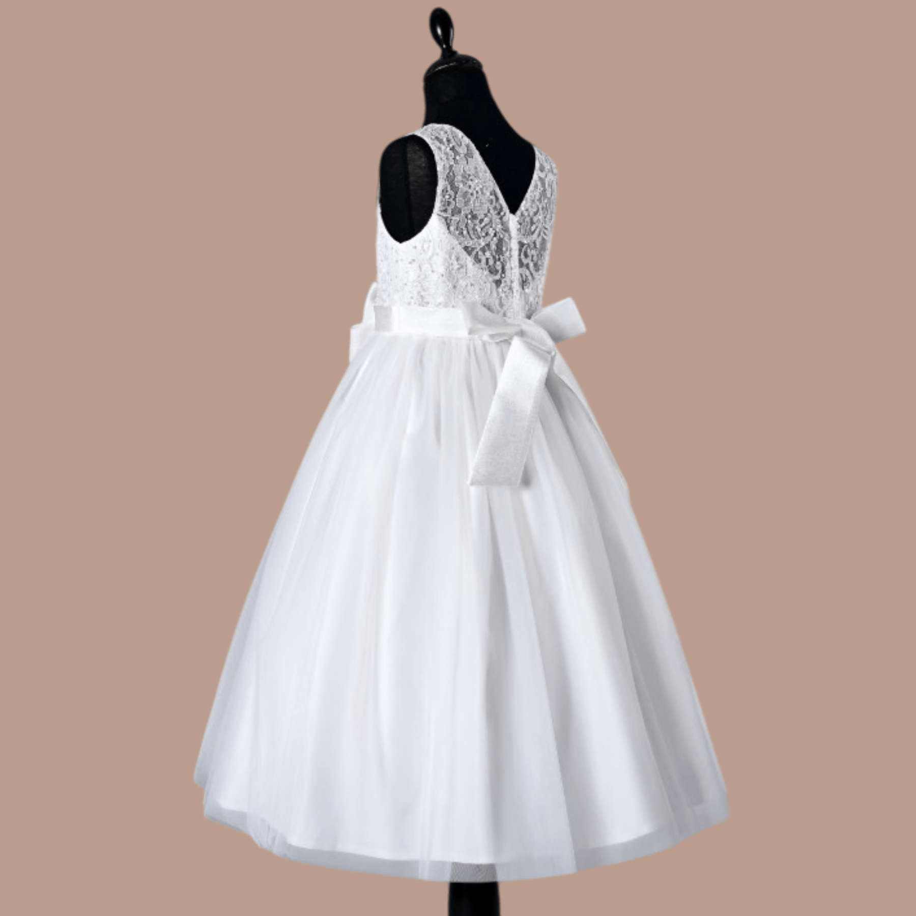 Es un dulce vestido de ceremonia, hecho de encaje y satén con una sobrefalda de tul. El cinturón de satén en la cintura agrega el toque final a este encantador vestido.