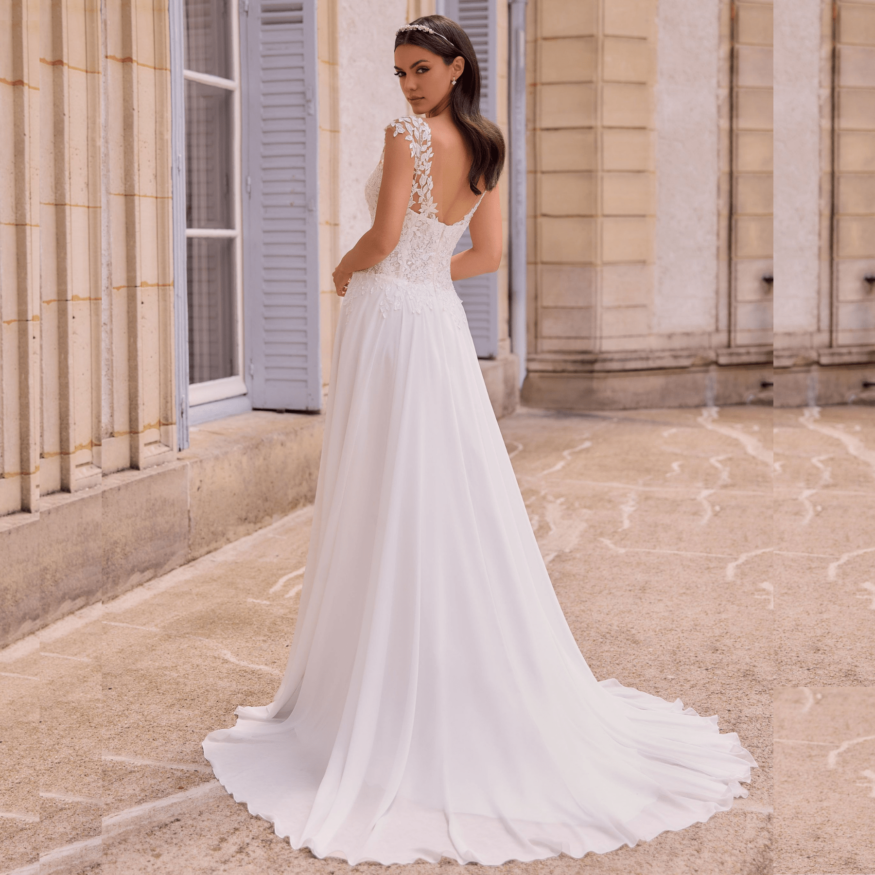 Vestido de Novia corte A, confeccionado en chiffon y encaje.