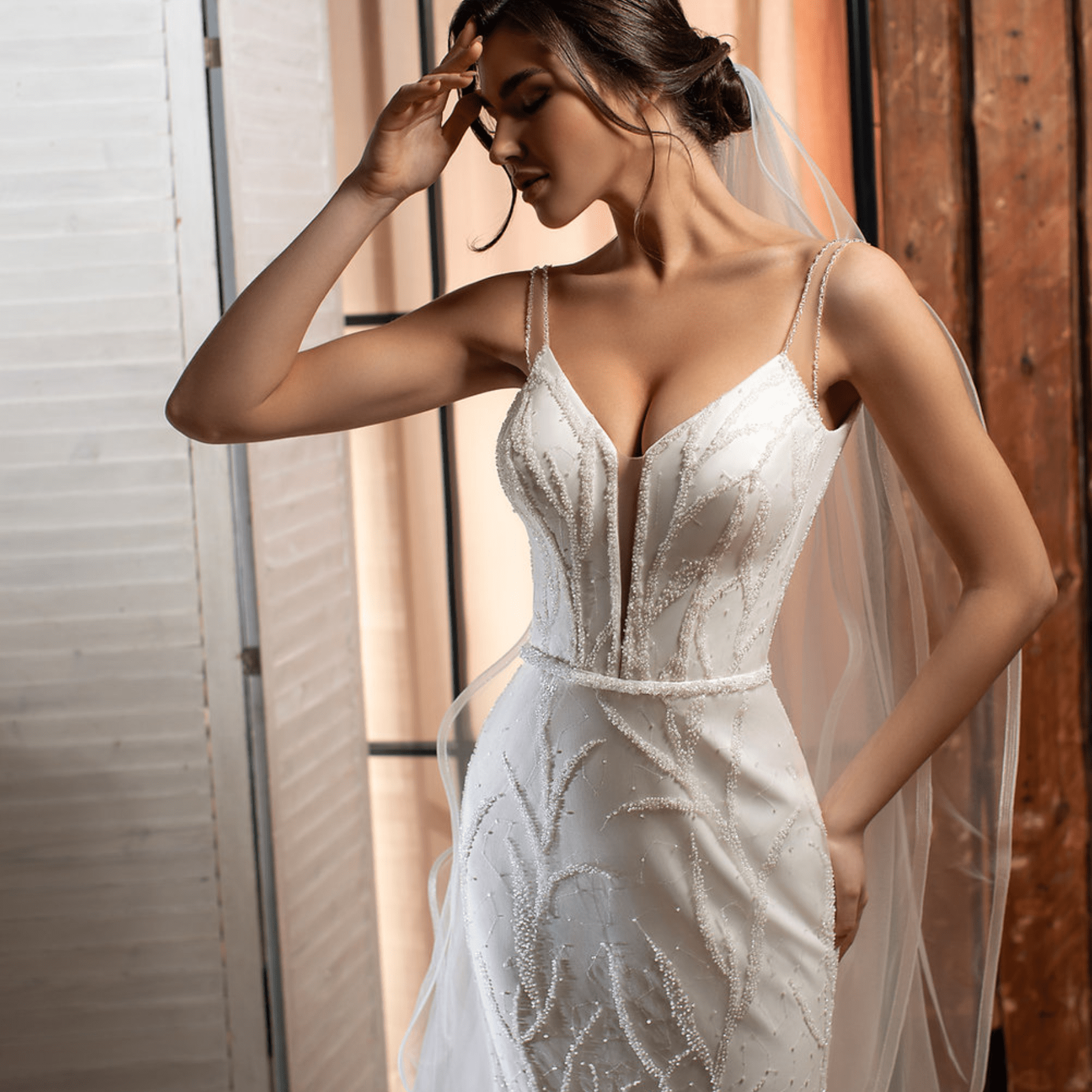 Vestido de Novia corte sirena, escote en V profundo, confeccionado en crepé y pedreria.