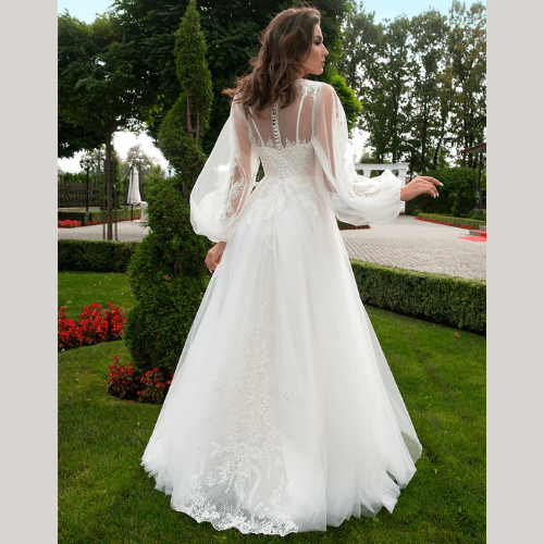 Vestido de Novia escote redondo ilusion, con mangas, confeccionado en tul y encaje.