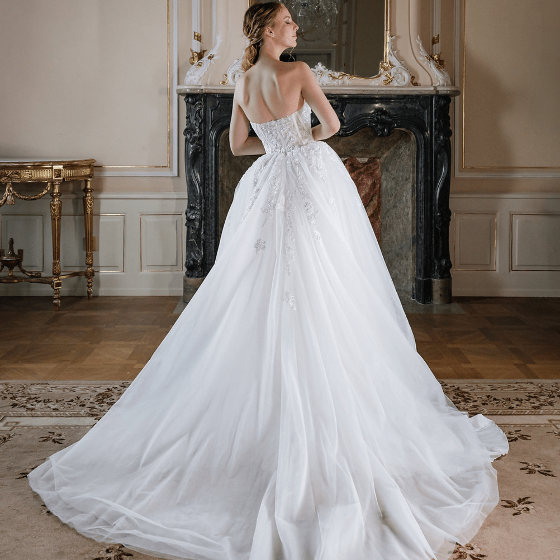 Vestido de Novia corte princesa, confeccionado enencaje y tul decorado en con pedrería.
