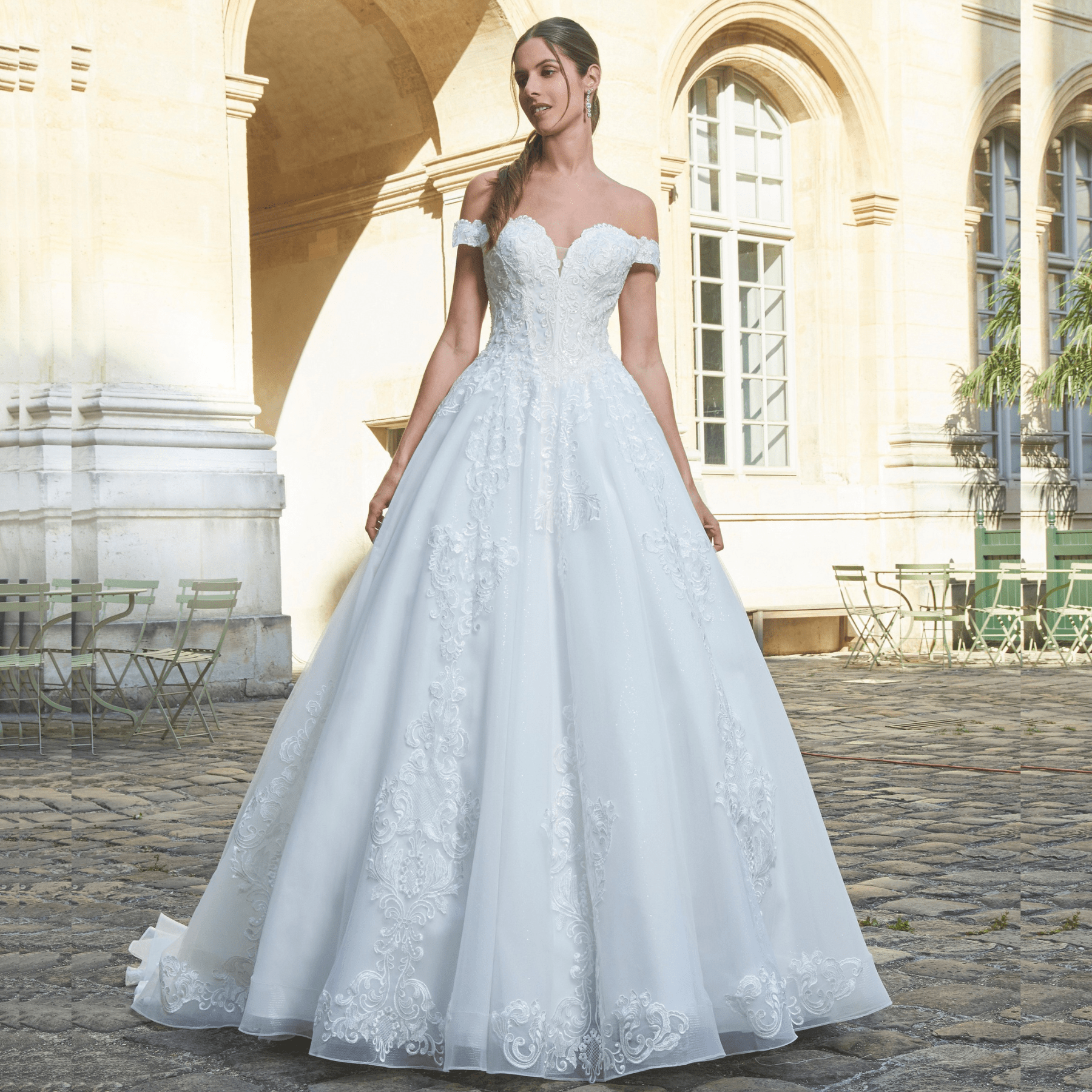 Vestido de novia corte princesa, escote bardot, confeccionado en tul con glitter y encaje, bordado con pedrería.