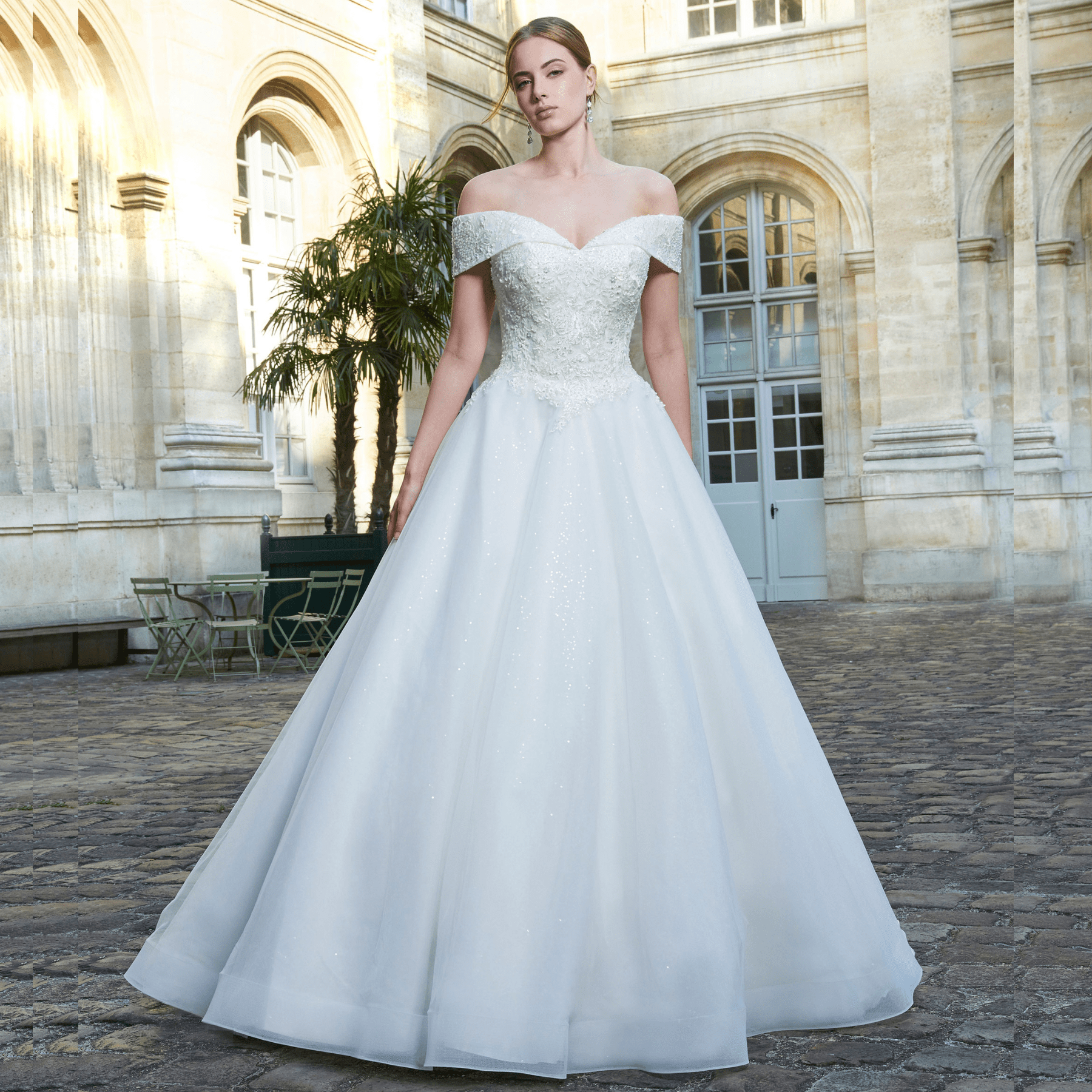 Vestido de novia corte princesa, escote bardot, confeccionado en tul con glitter y  encaje, bordado con pedrería.