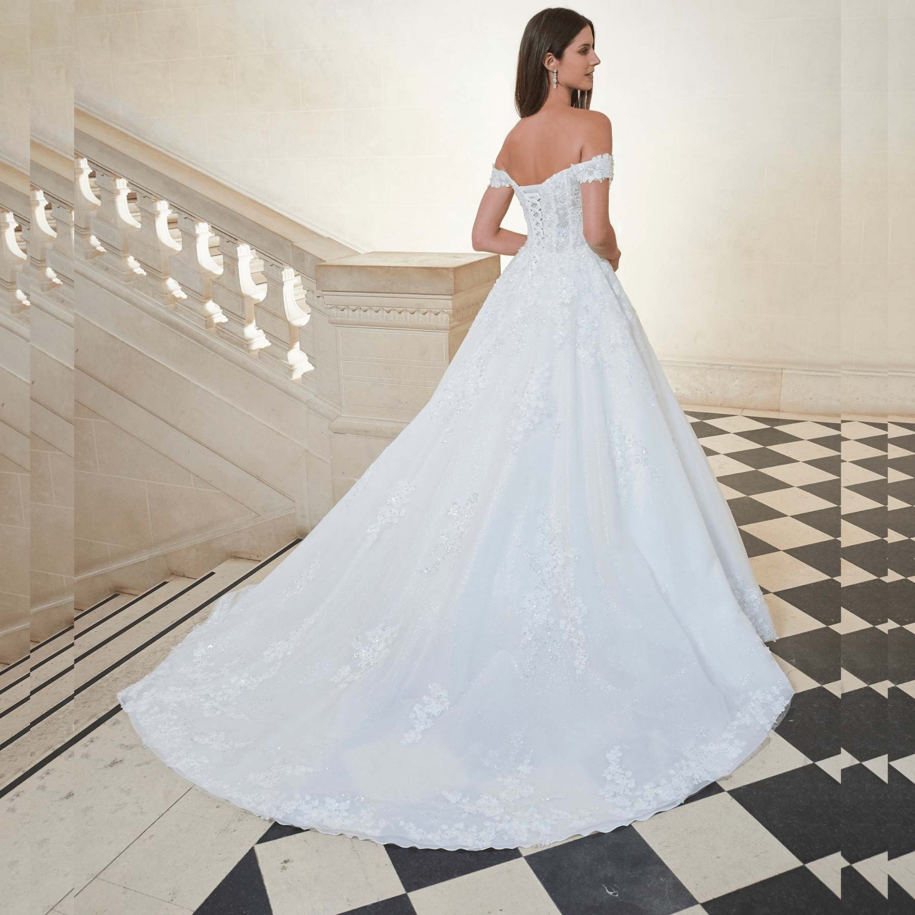 Vestido de novia corte princesa, escote bardot, confeccionado en tul con glitter y encaje, bordado con pedrería.