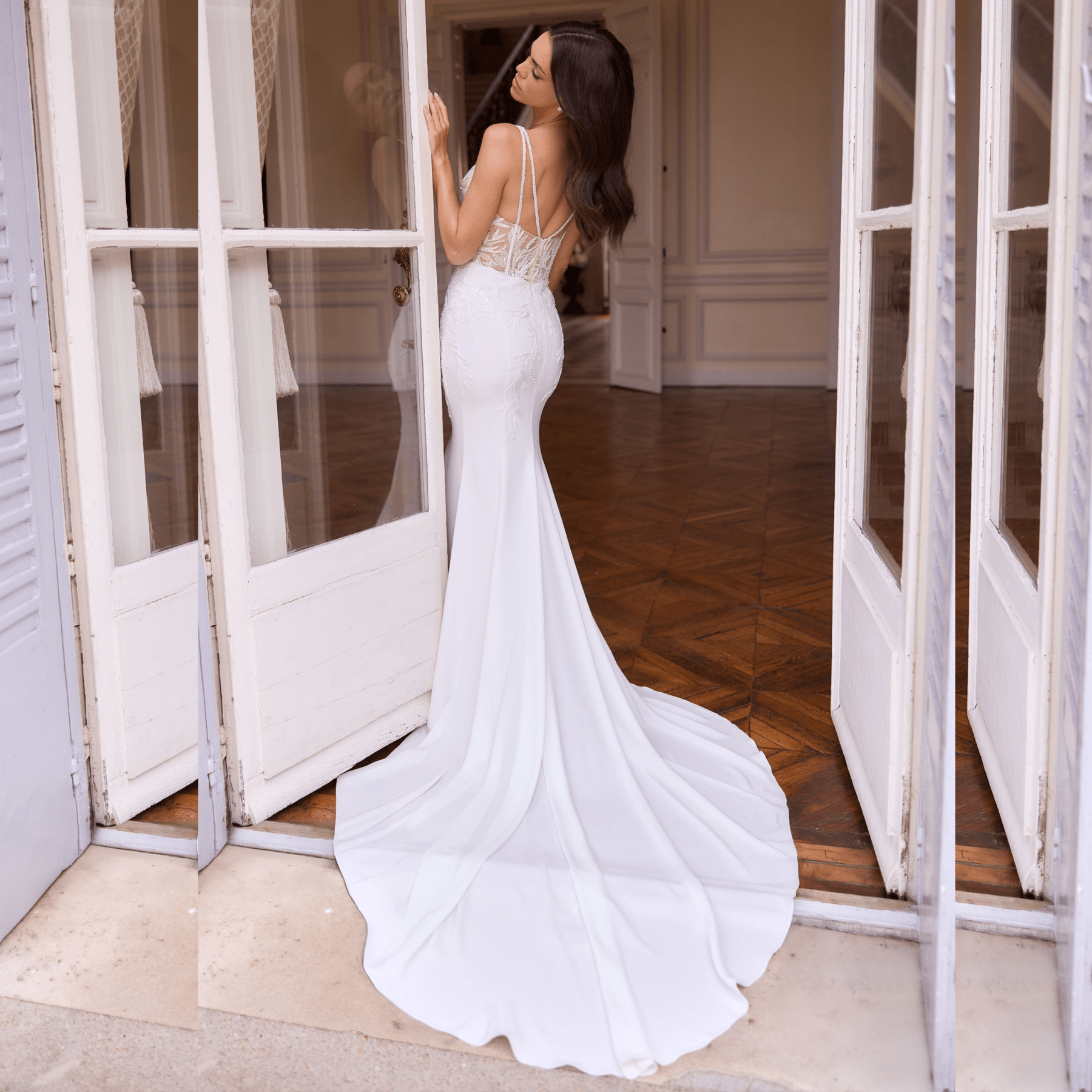 Vestido de Novia corte sirena, escote en V profundo, confeccionado en crepe.