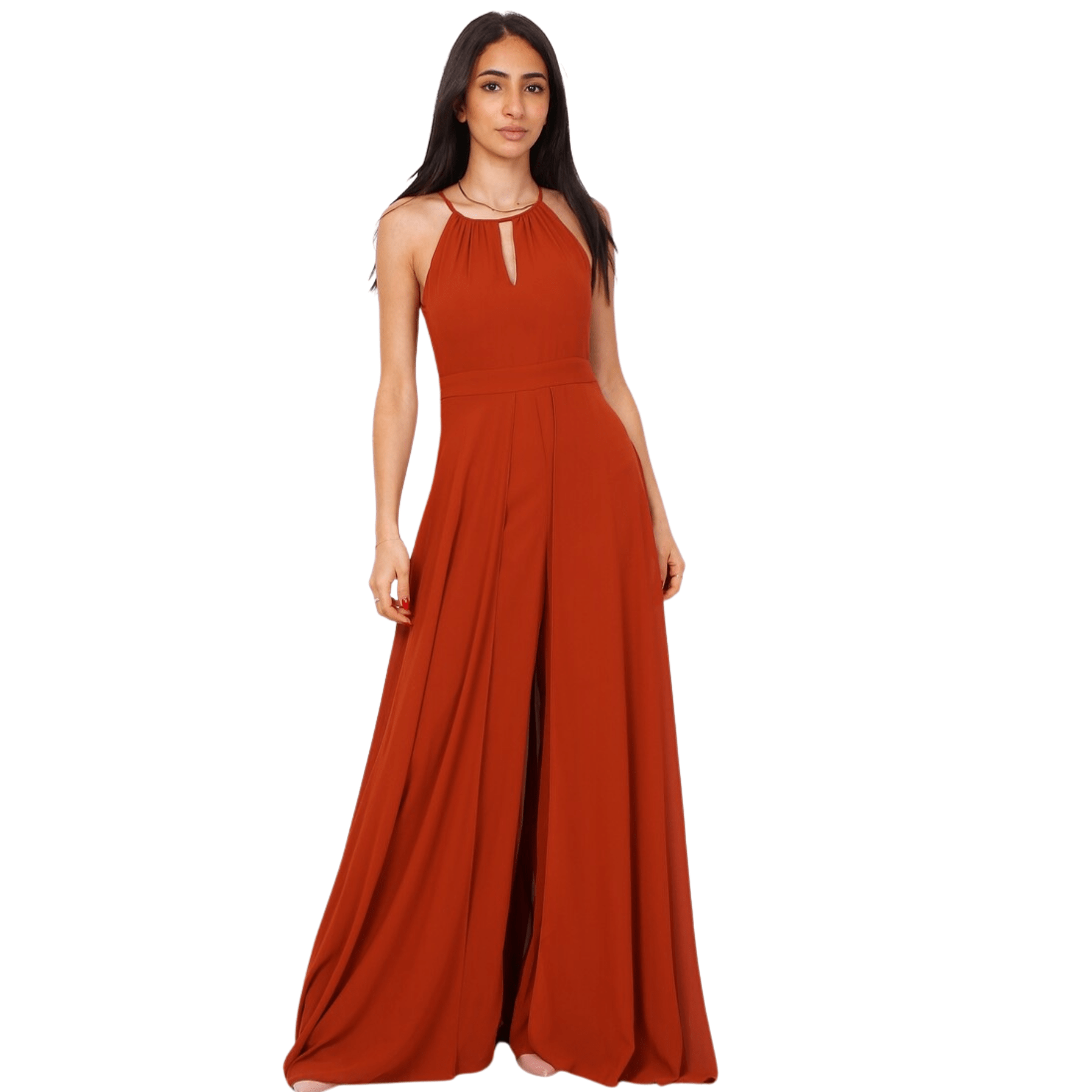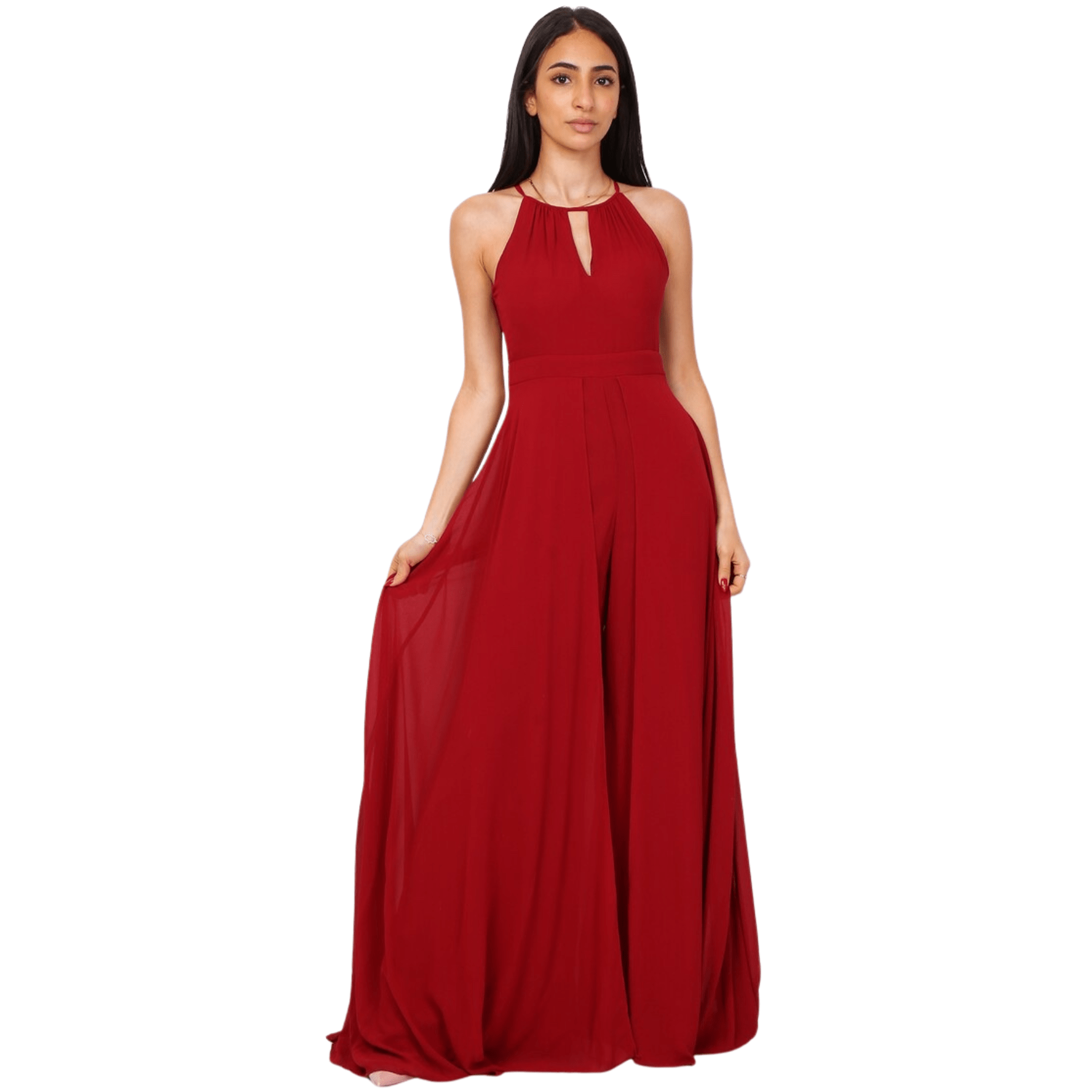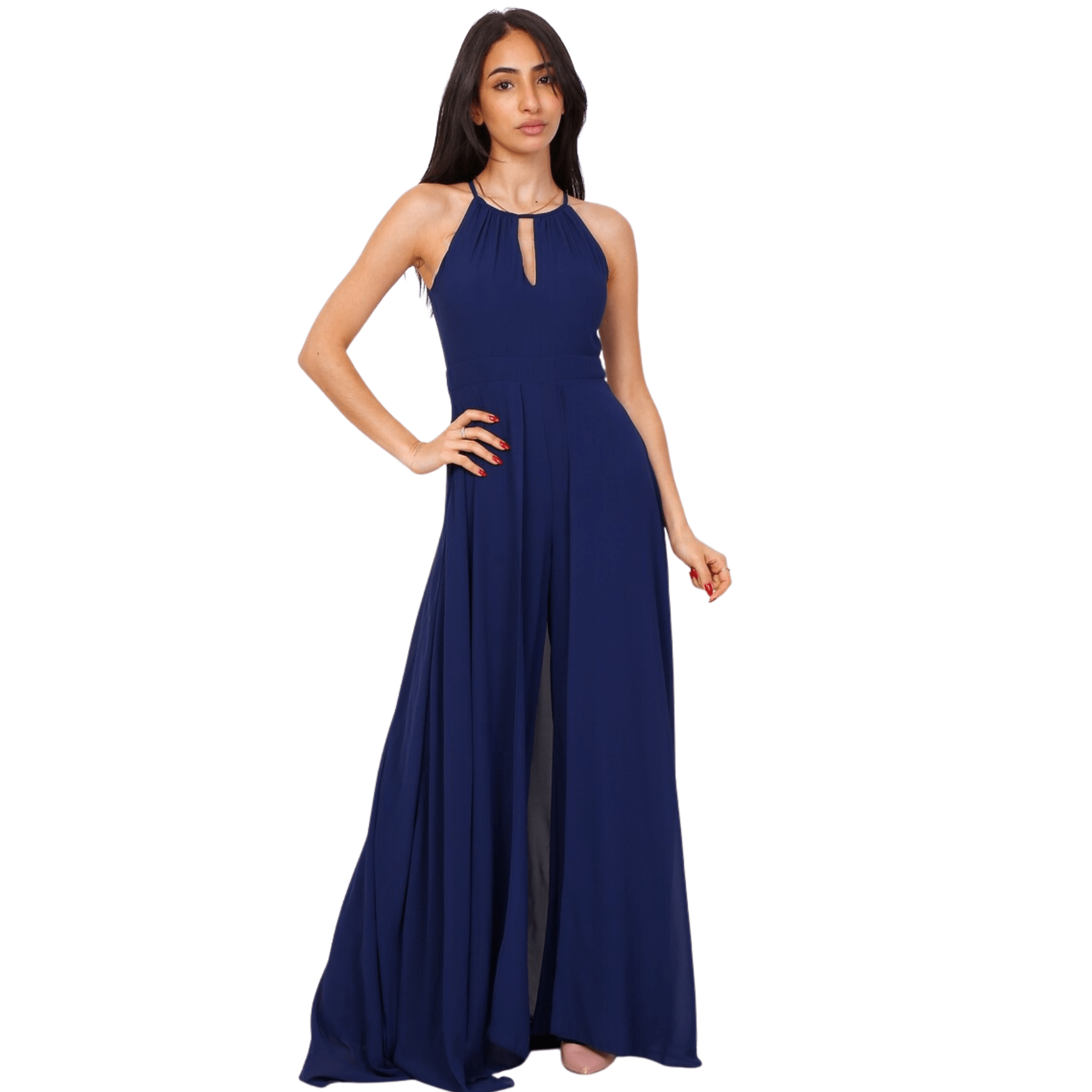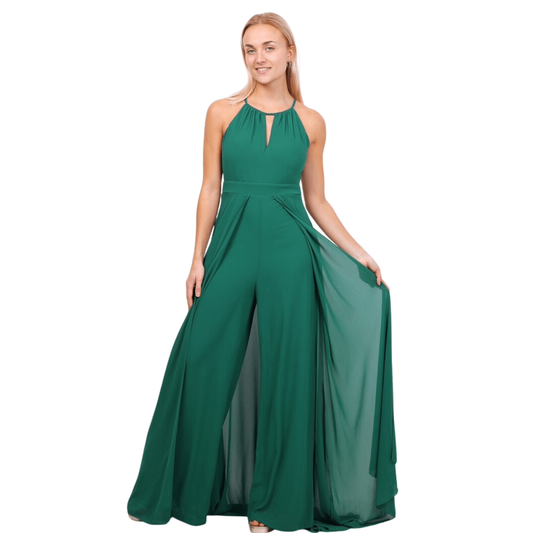 El detalle maestro de este mono reside en su falda superpuesta, aporta elegancia, movimiento y el efecto visual de llevar un vestido de gala por detrás, mientras se mantiene la comodidad y funcionalidad de un pantalón por delante.