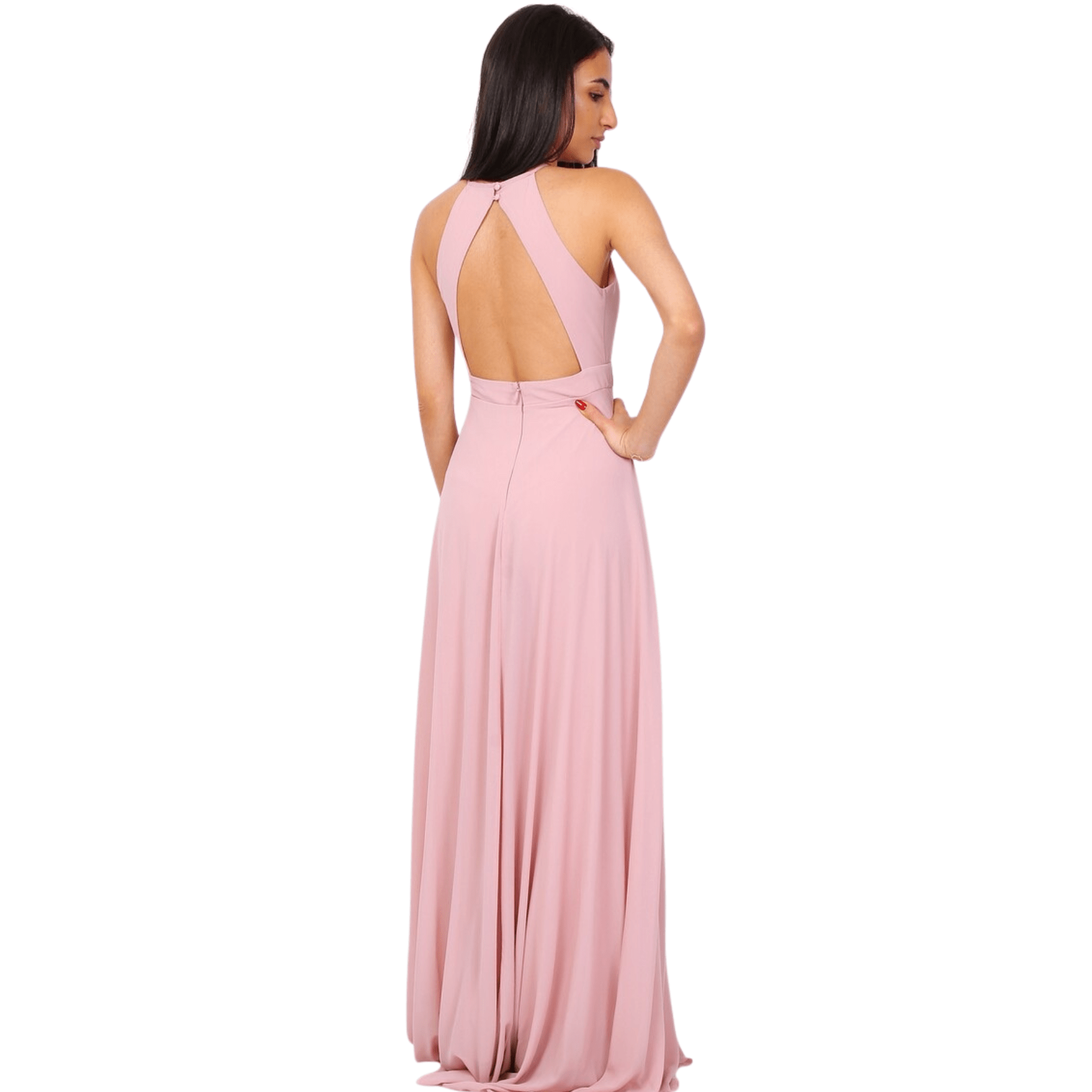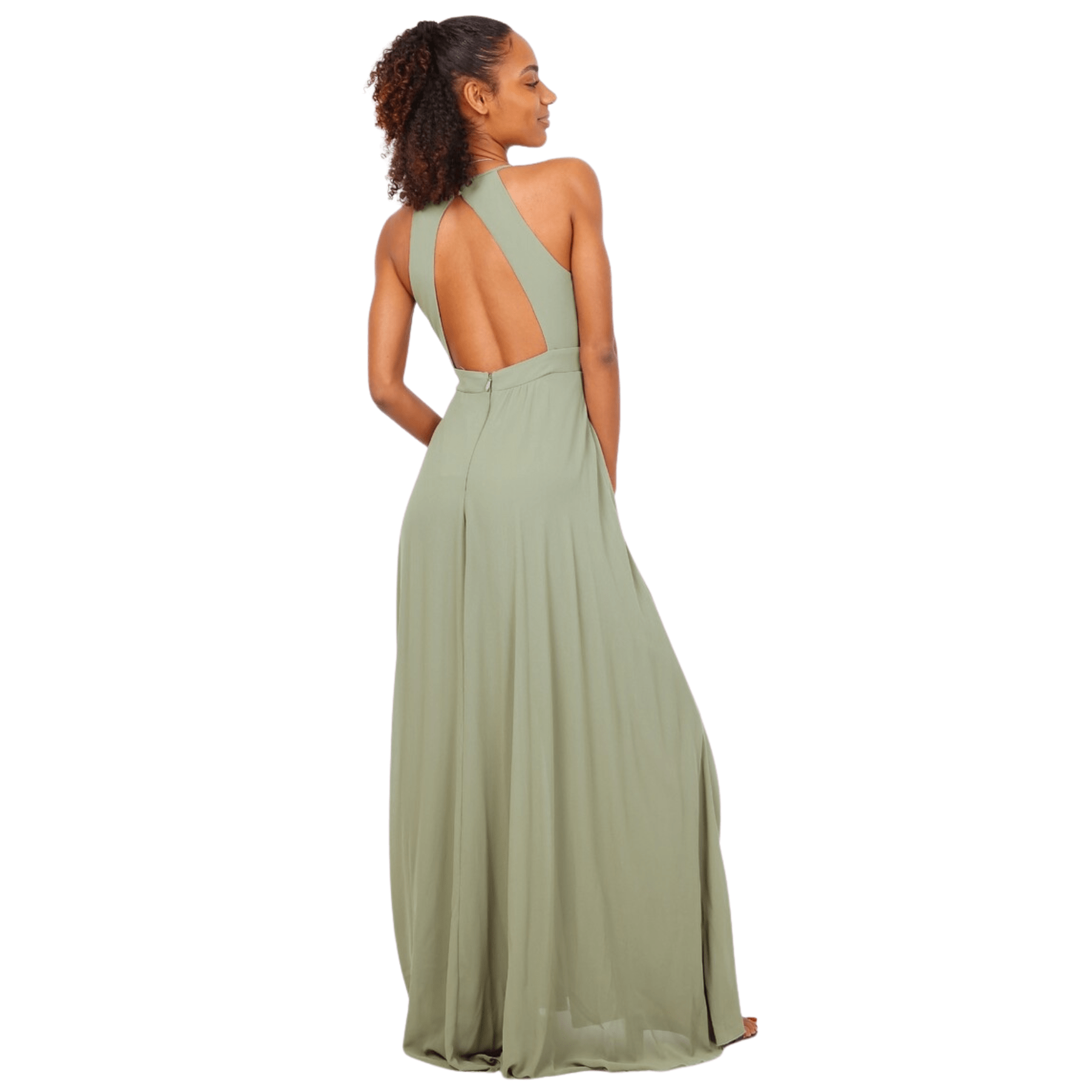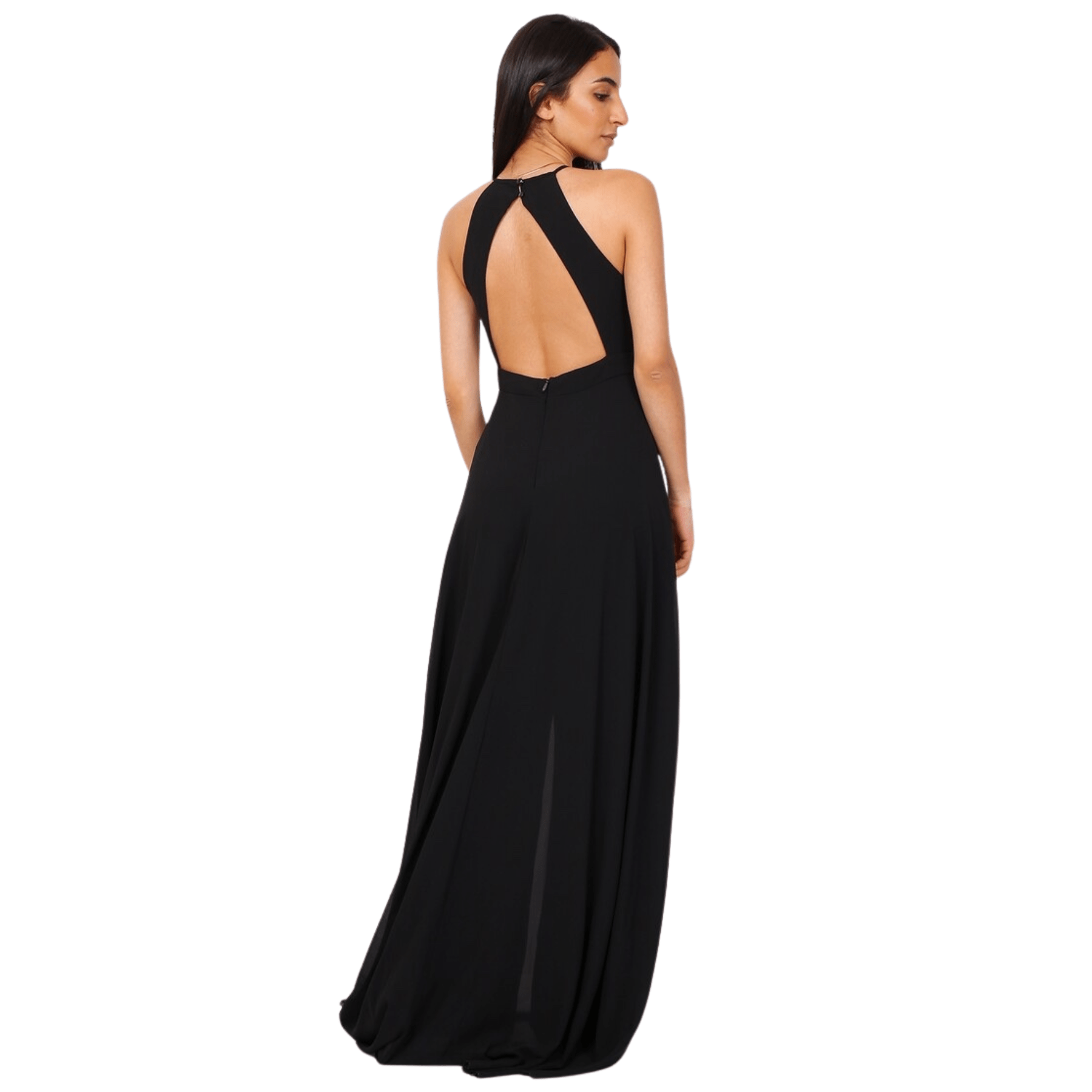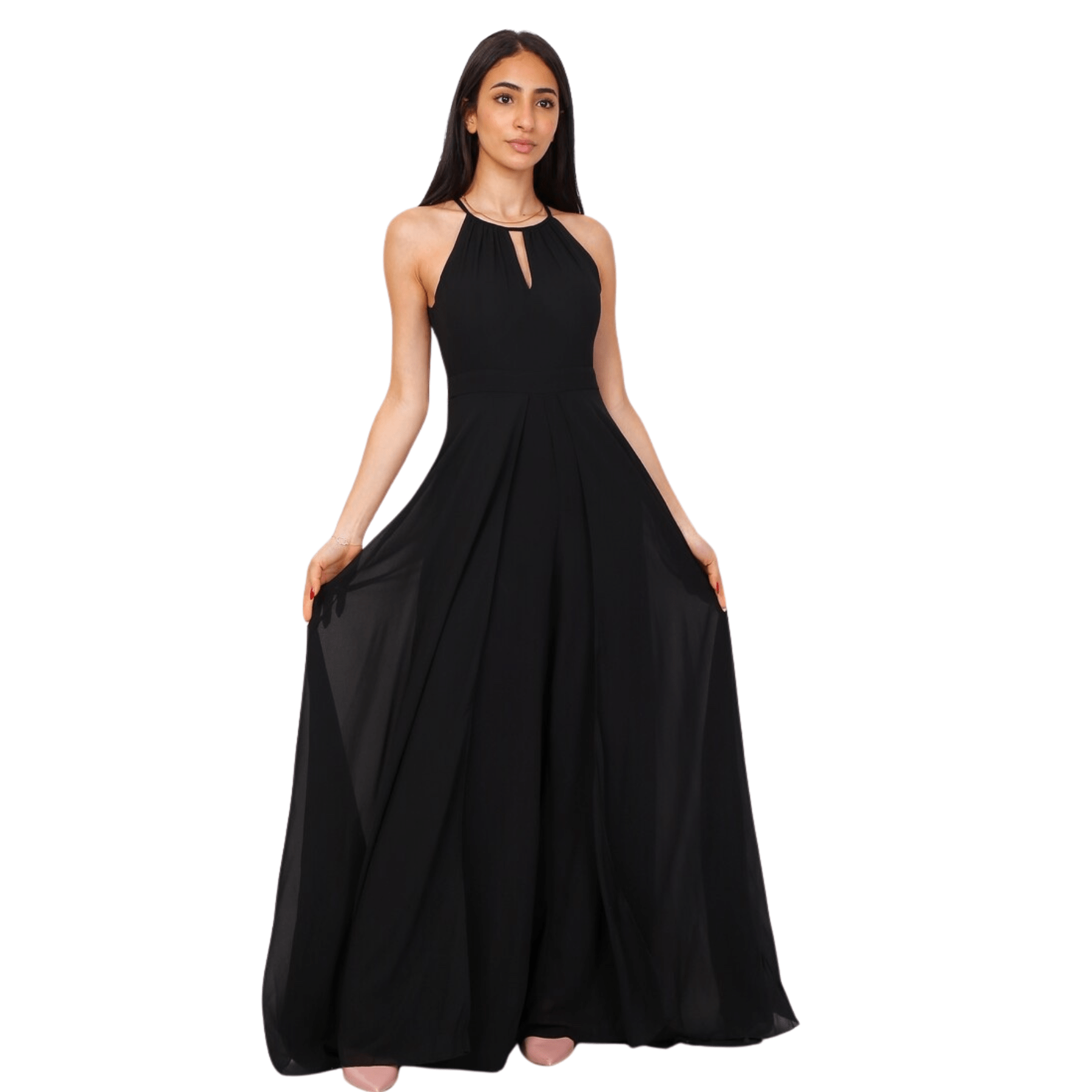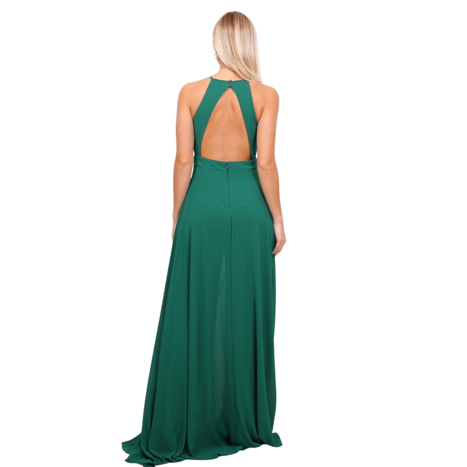 El diseño destaca por su cuello halter, que estiliza la silueta de forma sublime, complementado por un corte sin mangas que aporta una modernidad absoluta.