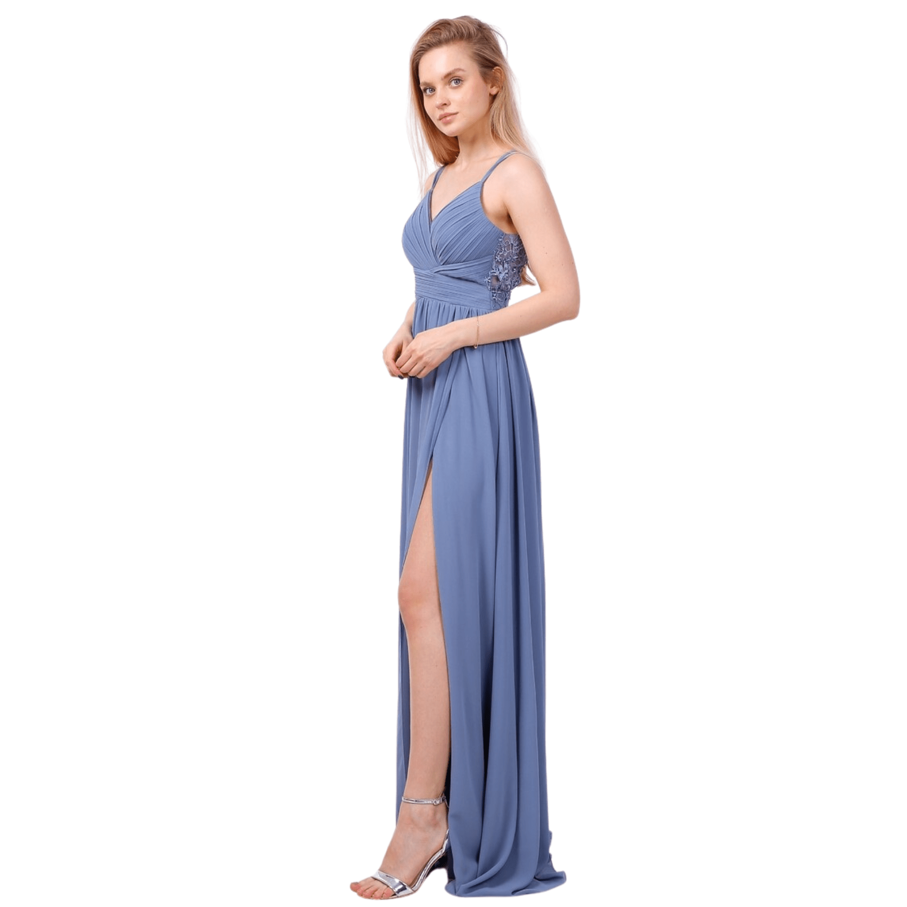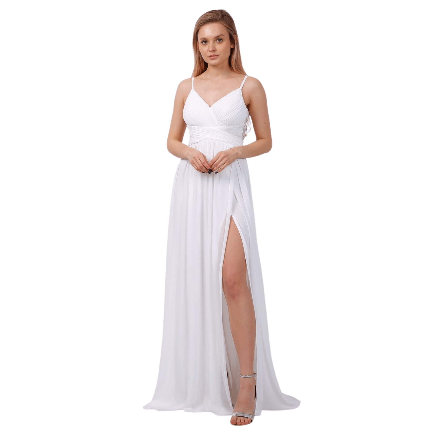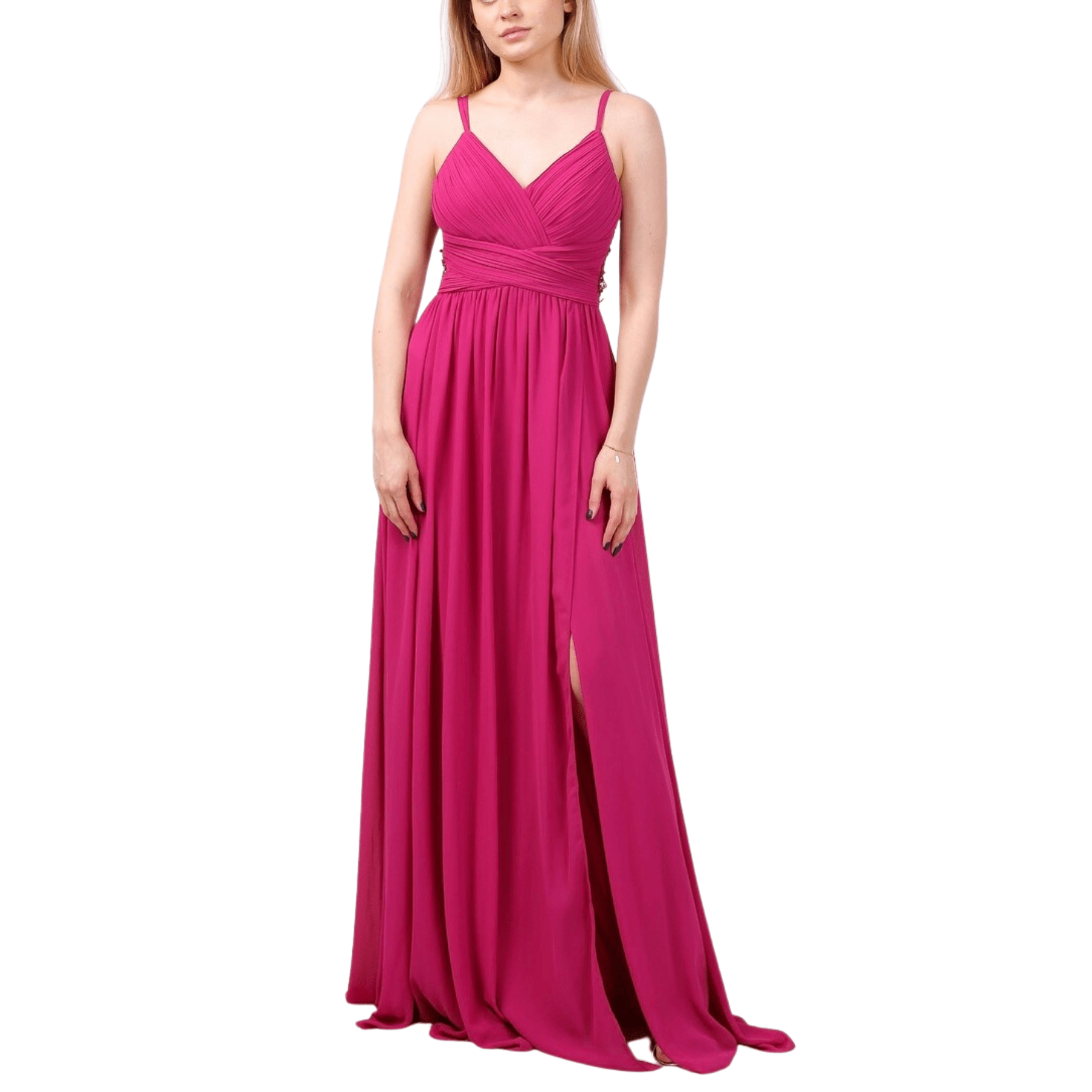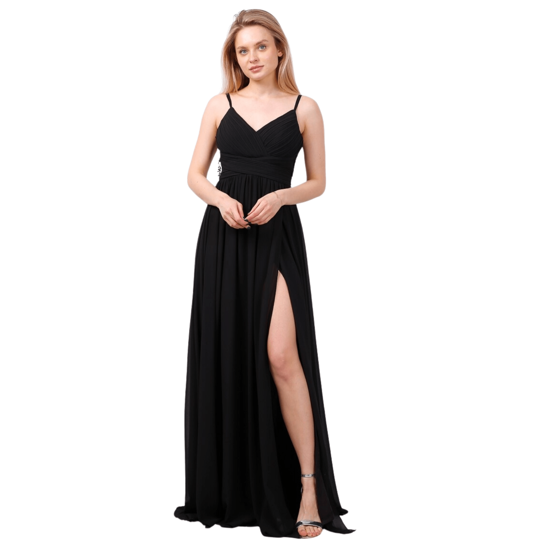 Viste tu confianza con este diseño exclusivo. Su escote en pico añade un toque romántico, mientras que la raja lateral ofrece un movimiento fluido y moderno.