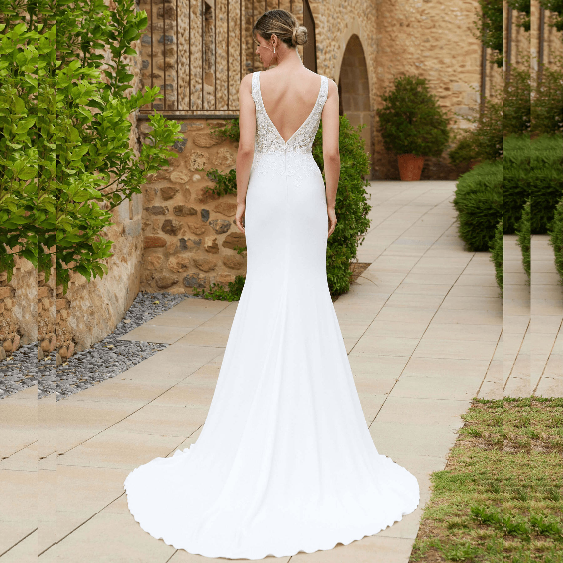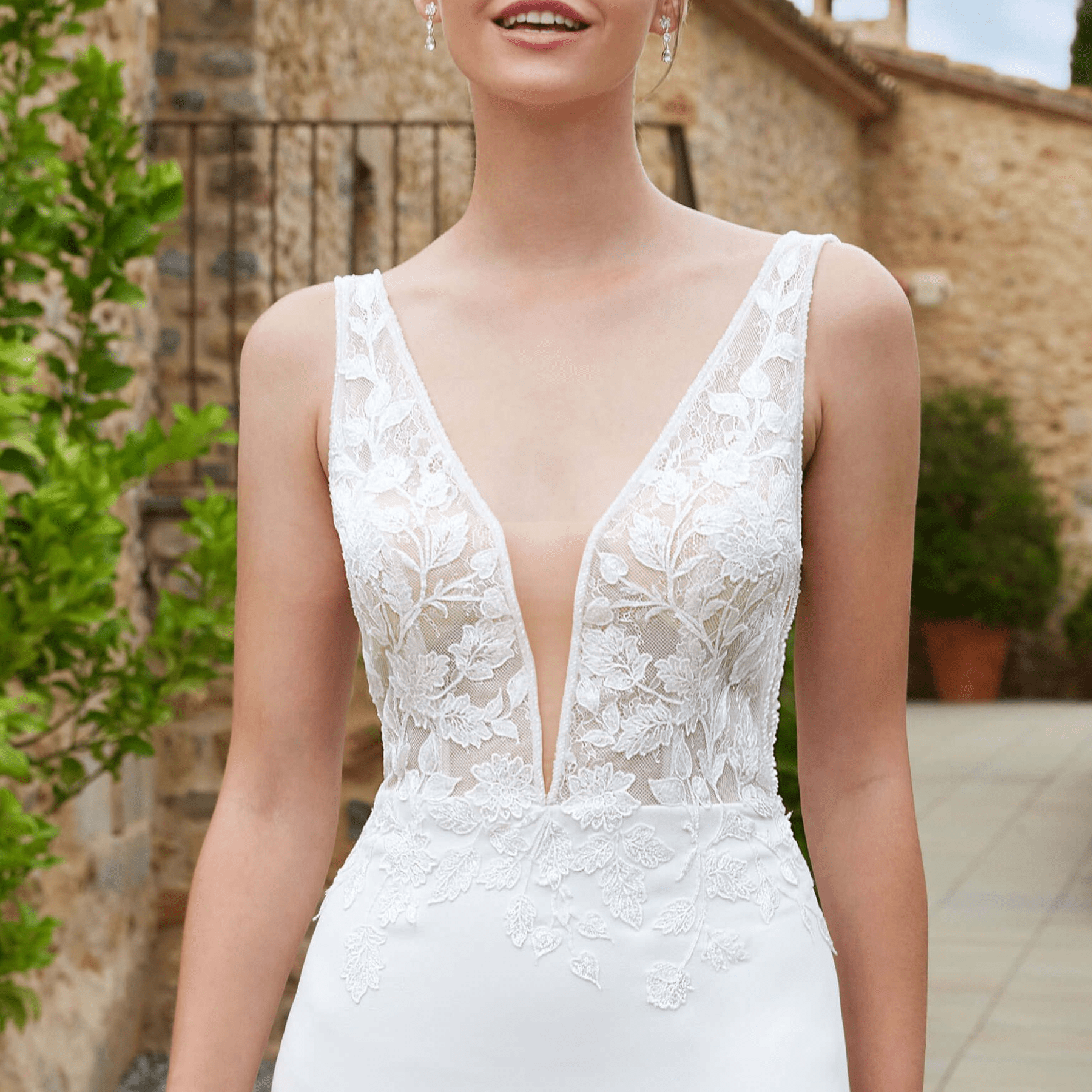 Vestido de Novia corte sirena, escote en V profundo, confeccionado en georgette y encaje.