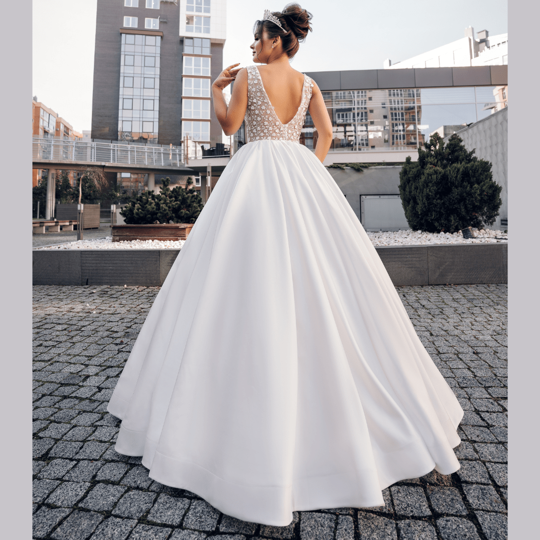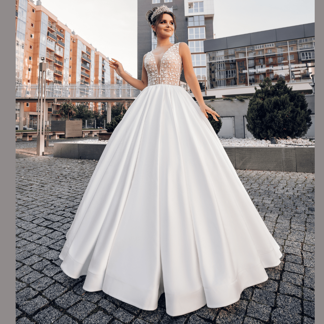 Vestido de Novia corte princesa, escote profundo en V, confeccionado en raso con encaje 3D.