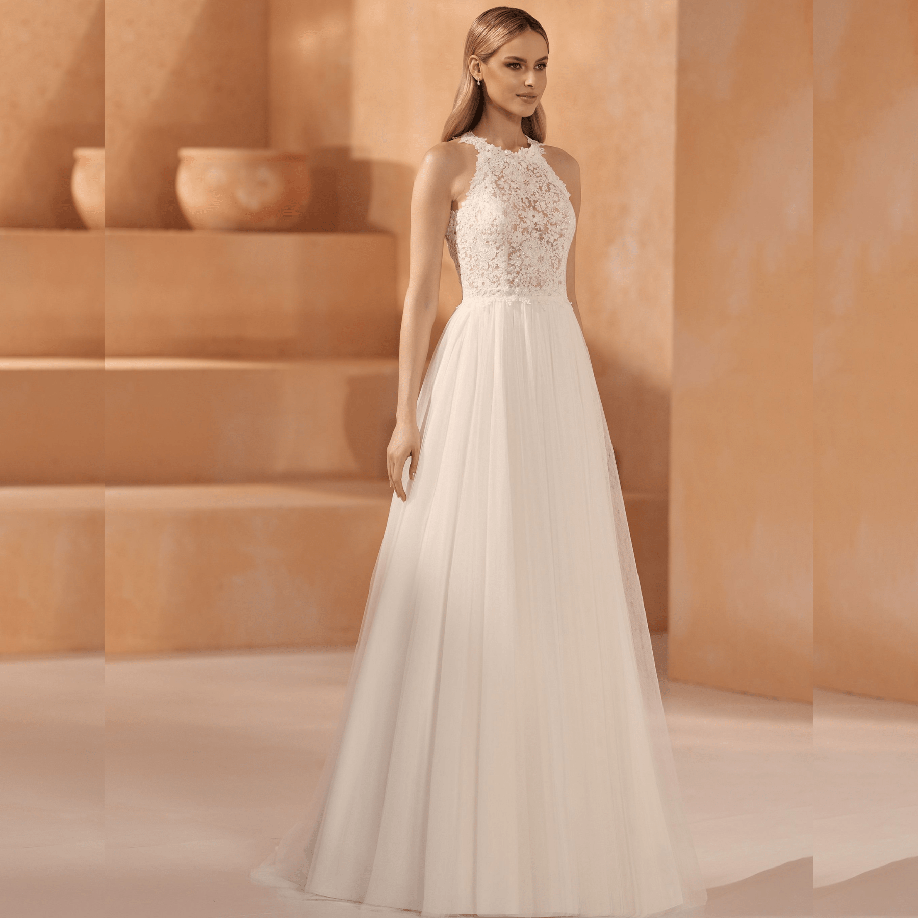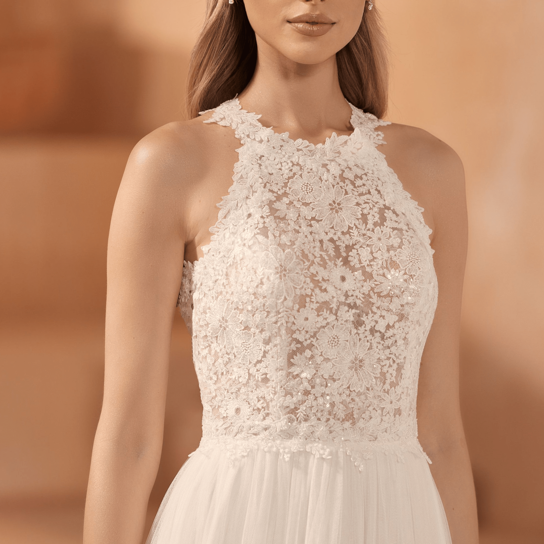 Vestido de Novia corte A, escote halter, confeccionado en tul y encaje.